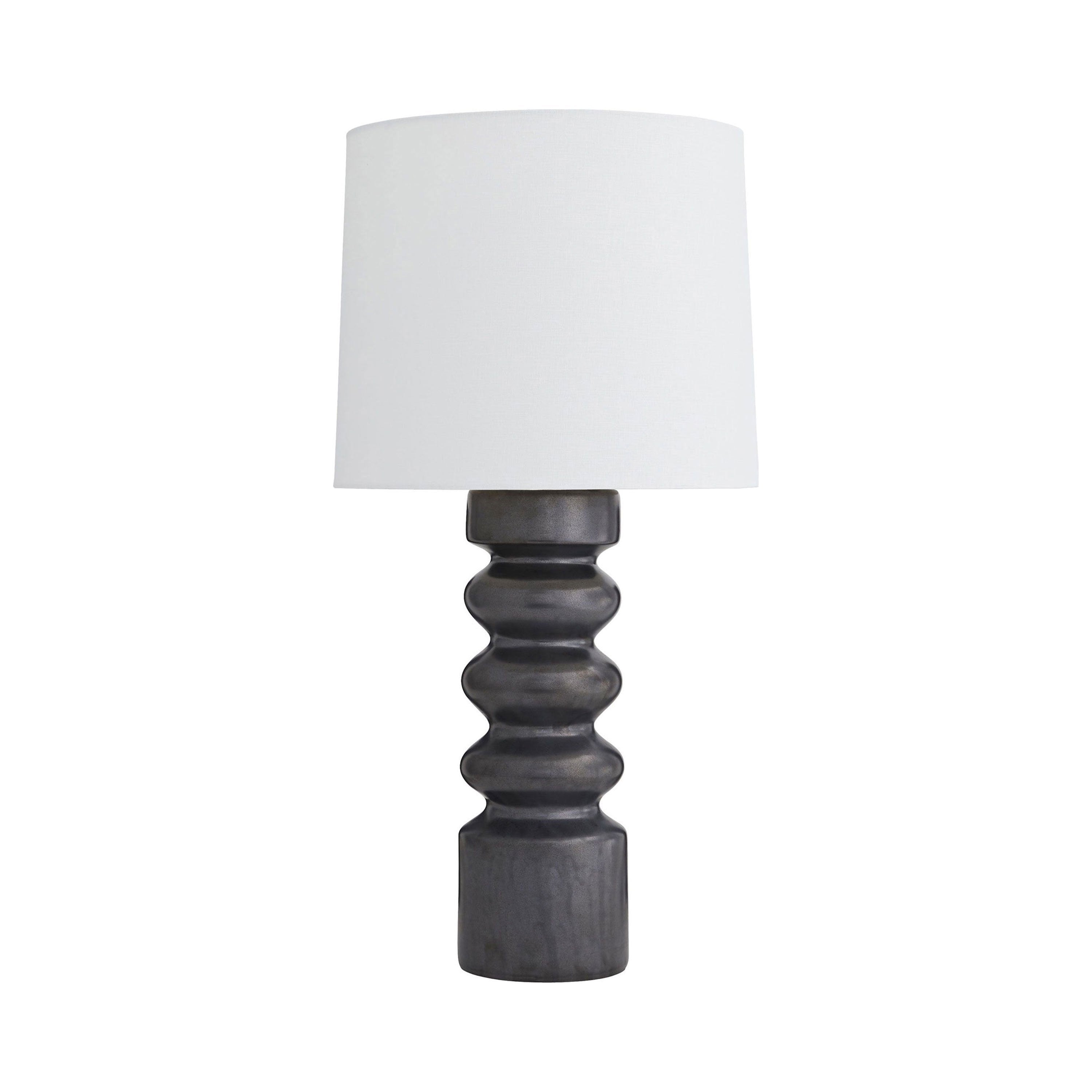 Undulating porcelain cylinder shape has been finished with a metallic gunmetal reactive glaze or a white crackle. The tall drum white linen shade is lined in white cotton and has a porcelain finial to match.