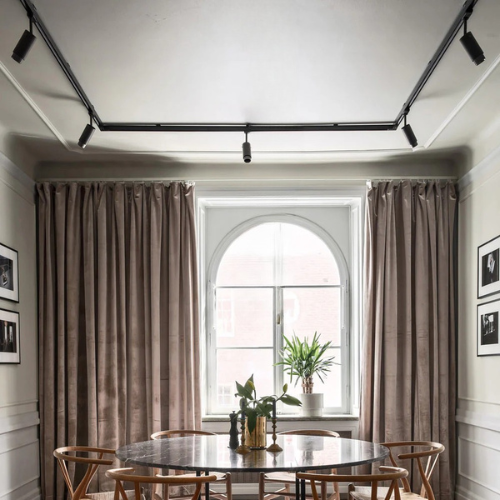 - Black Track Lighting: Black track lighting adds a bold, contemporary contrast to lighter walls and ceilings or complements darker interiors. It brings a touch of sophistication, making it an excellent choice for industrial or modern living rooms, workspaces, and dining areas.