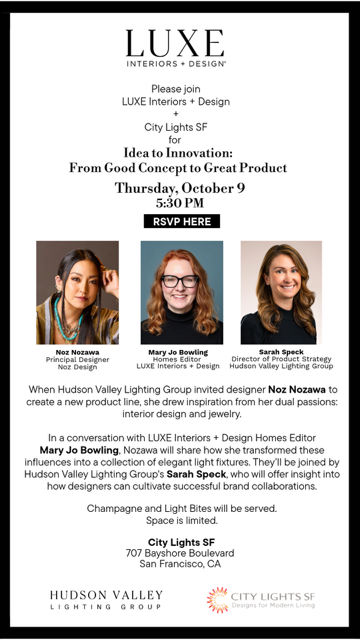 In a conversation with LUXE Interiors + Design Homes Editor Mary Jo Bowling. Nozawa will share how she transformed these influences into a collection of elegant light fixtures. They'll be joined by Hudson Valley Lighting Group's Sarah Speck, who will offer insight into how designers can cultivate successful brand collaborations.