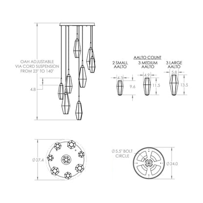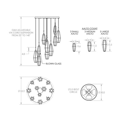 - 8-Light: 27.4"D X 23"H; 140" max height
