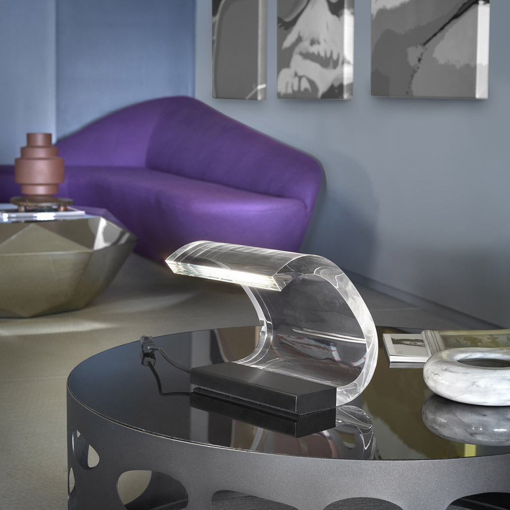 Joe Colombo‘s first project for Oluce, the only one worked on together with his brother Gianni. From then on, the two Colombo brothers clearly separated their fields; Joe left art in which he had shown interesting promise with “Nucleari”, while Gianni no longer worked in design, becoming one of the leading exponents of the kinetic, programmed movement. The 281 model, created in 1962, was immediately nicknamed “Acrilica” due to its surprising conspicuousness and exception innovation of the significant curve made from acrylic. Methacrylate, used for about a decade in the field of lighting, usually in thin sheets that are cut or thermoformed, found a very particular use here; its thickness and curve meant that, thanks to its conduction properties, the light from a fluorescent lamp contained within the painted steel base moved through the transparent body, eventually lighting the head in an incredible way. Due to this “magical movement”, “281” is more a work of kinetic art than a lamp.
