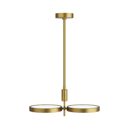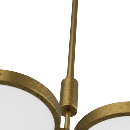 Down to basics with design, the Alexander LED Chandelier from Arteriors embraces minimalism to make a maximal impression in a modern or transitional space. This symmetrical fixture offers a perpendicular design featuring antiqued brass finish metal with disc shades nestling glass diffusers. A vintage ophthalmologic design conjures romantically dated look updated for modern purposes.