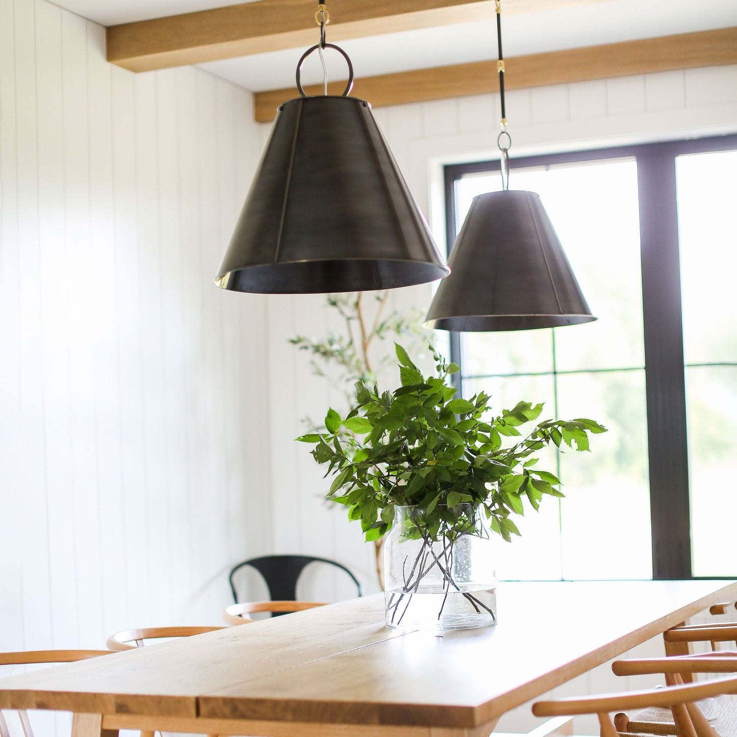 A perennial favorite for kitchen islands but just as suitable to numerous other locations, Altamont Pendant Light is available with either metal or paper cone shades. In cast metal, these shades showcase sumptuous finishes, rivet and seam details creating a refined industrial look. Paper shades allow light to pass through rather than funnel out and down. Accent details along the unique ring-and-rod chain and wide hoop holders contribute to the impression Altamont makes.