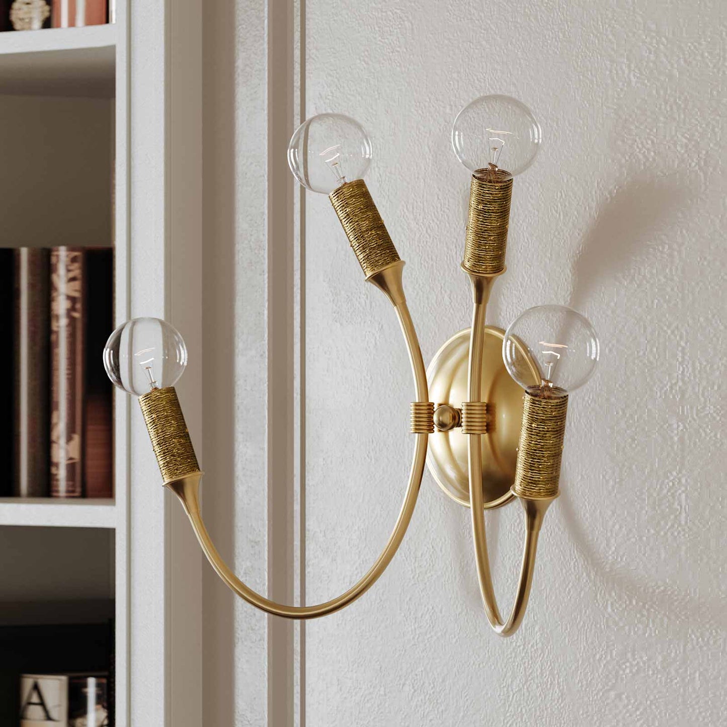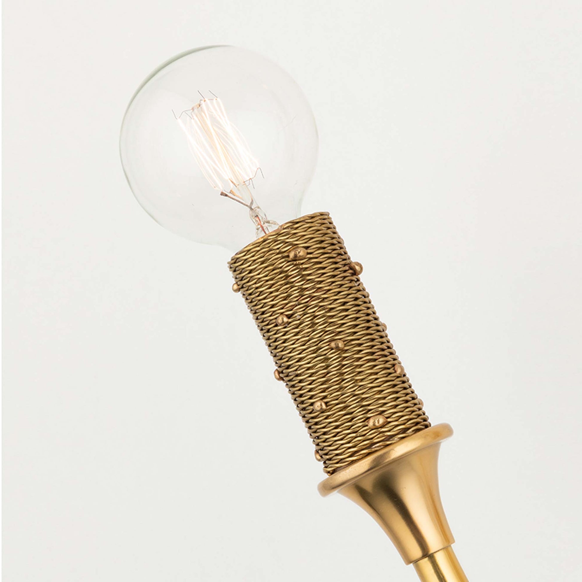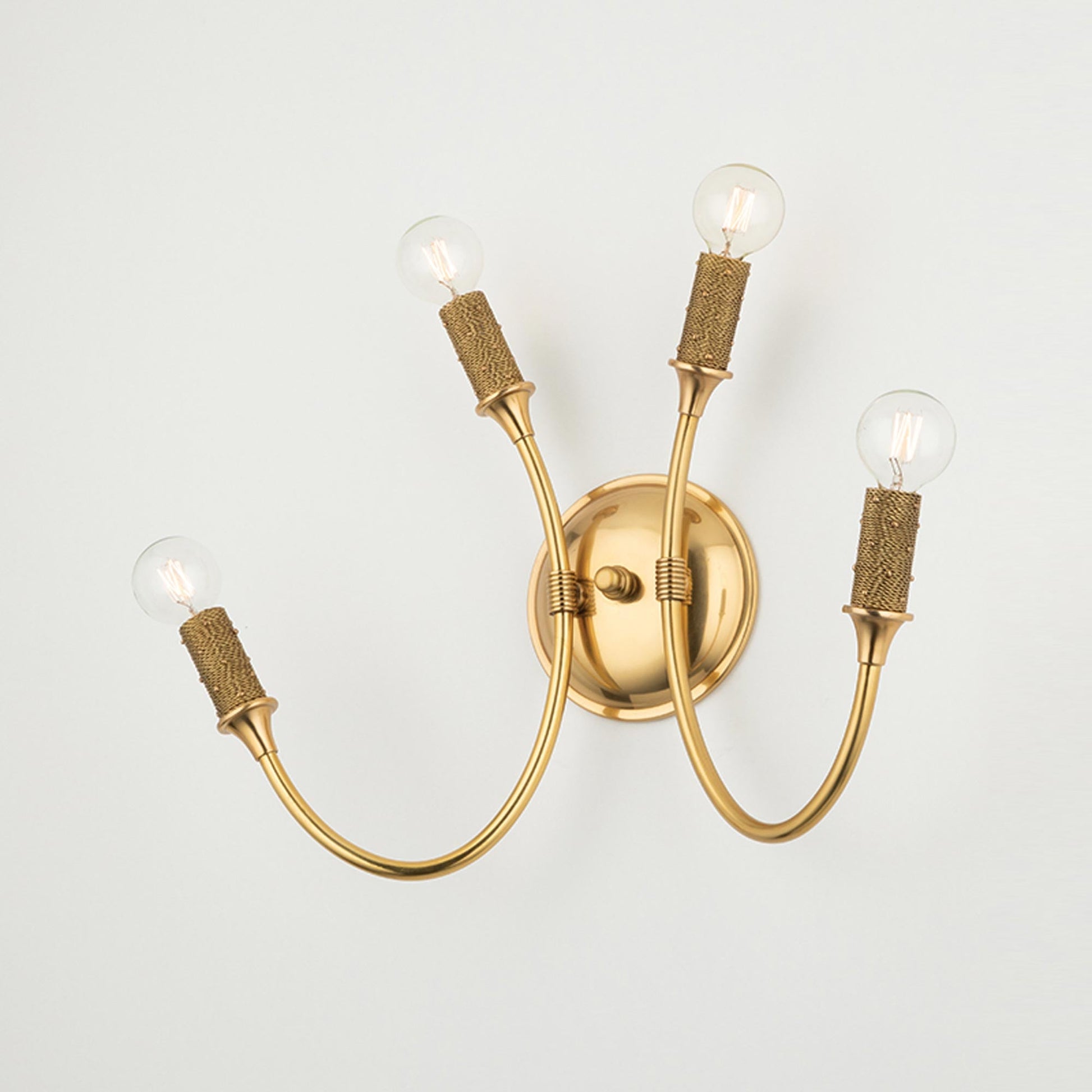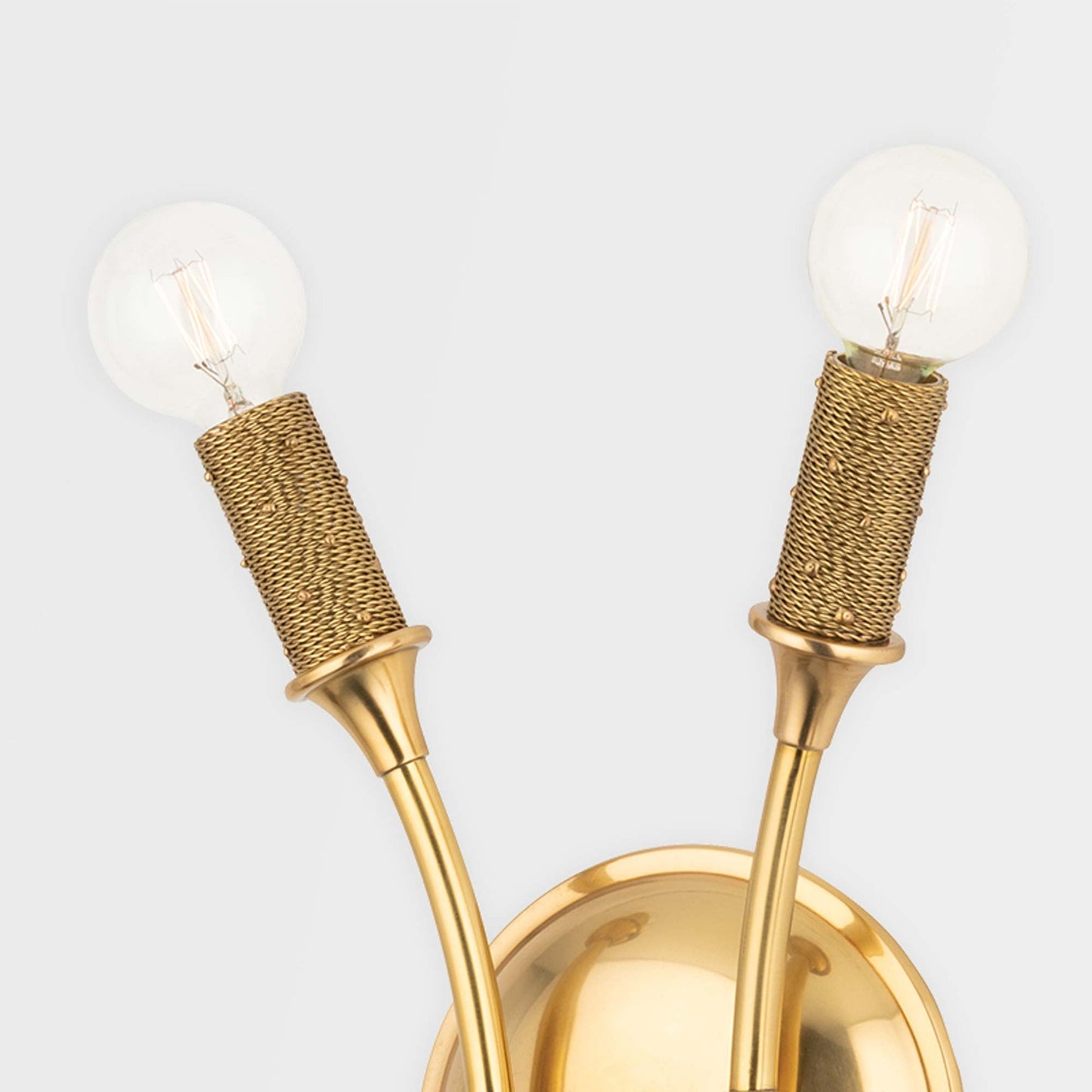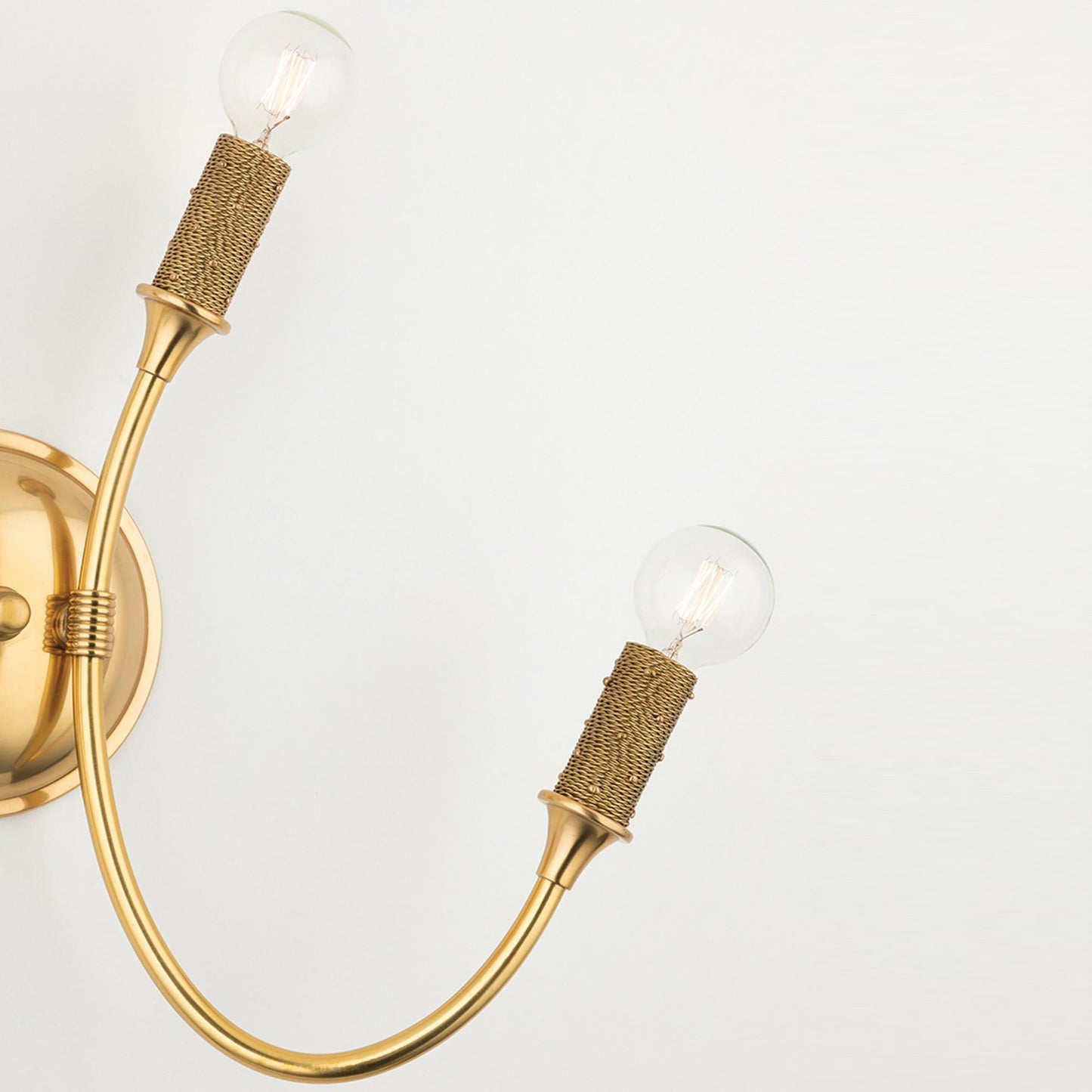 Swooping curves create a sense of freeform energy and whimsy for the Amboy Wall Light from Hudson Valley Lighting. Setting the tone in a welcoming living space, the sconce delivers intriguing reflectivity with wire-wrapped socket cups and incredible warmth with aged brass finish updated for a modern sensibility.