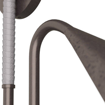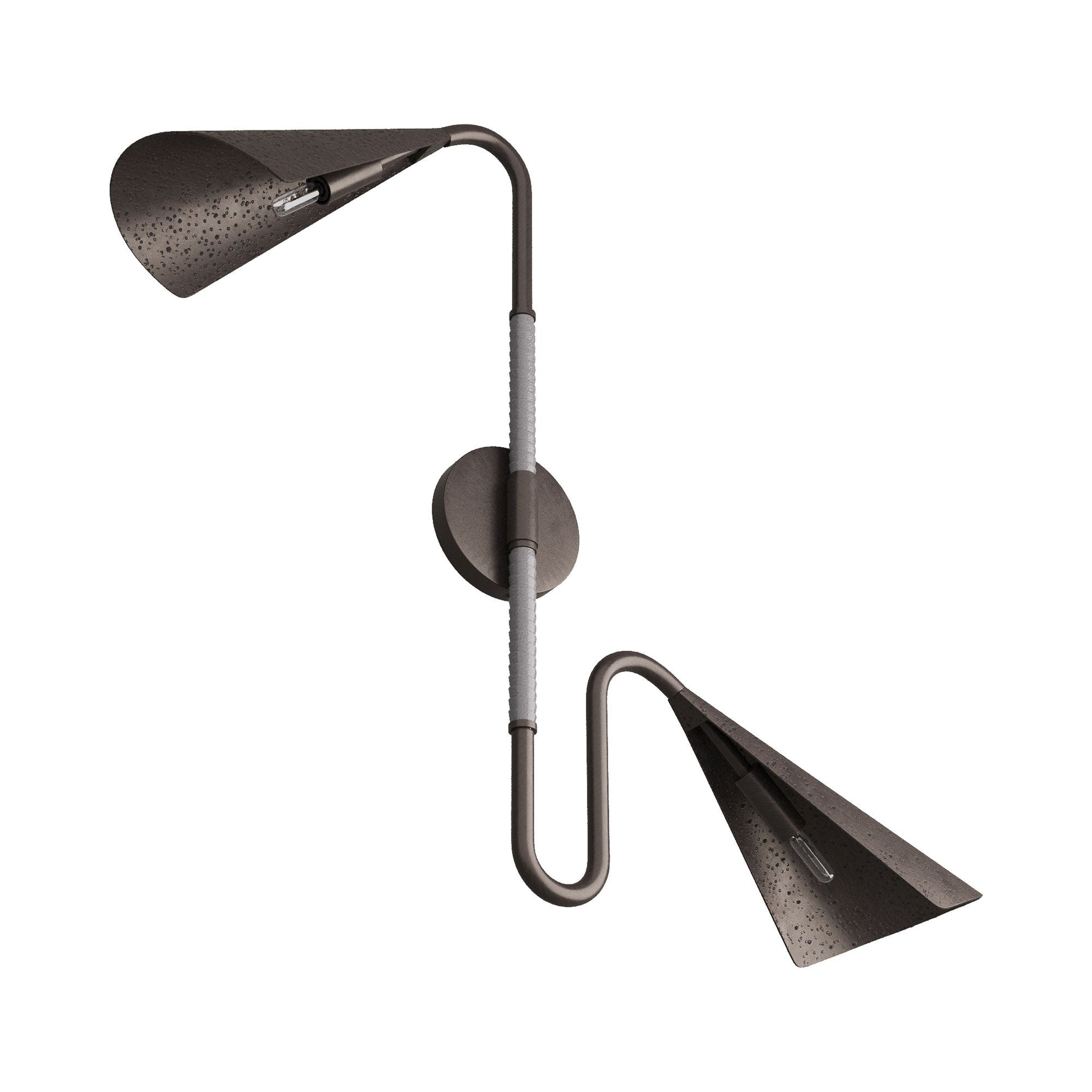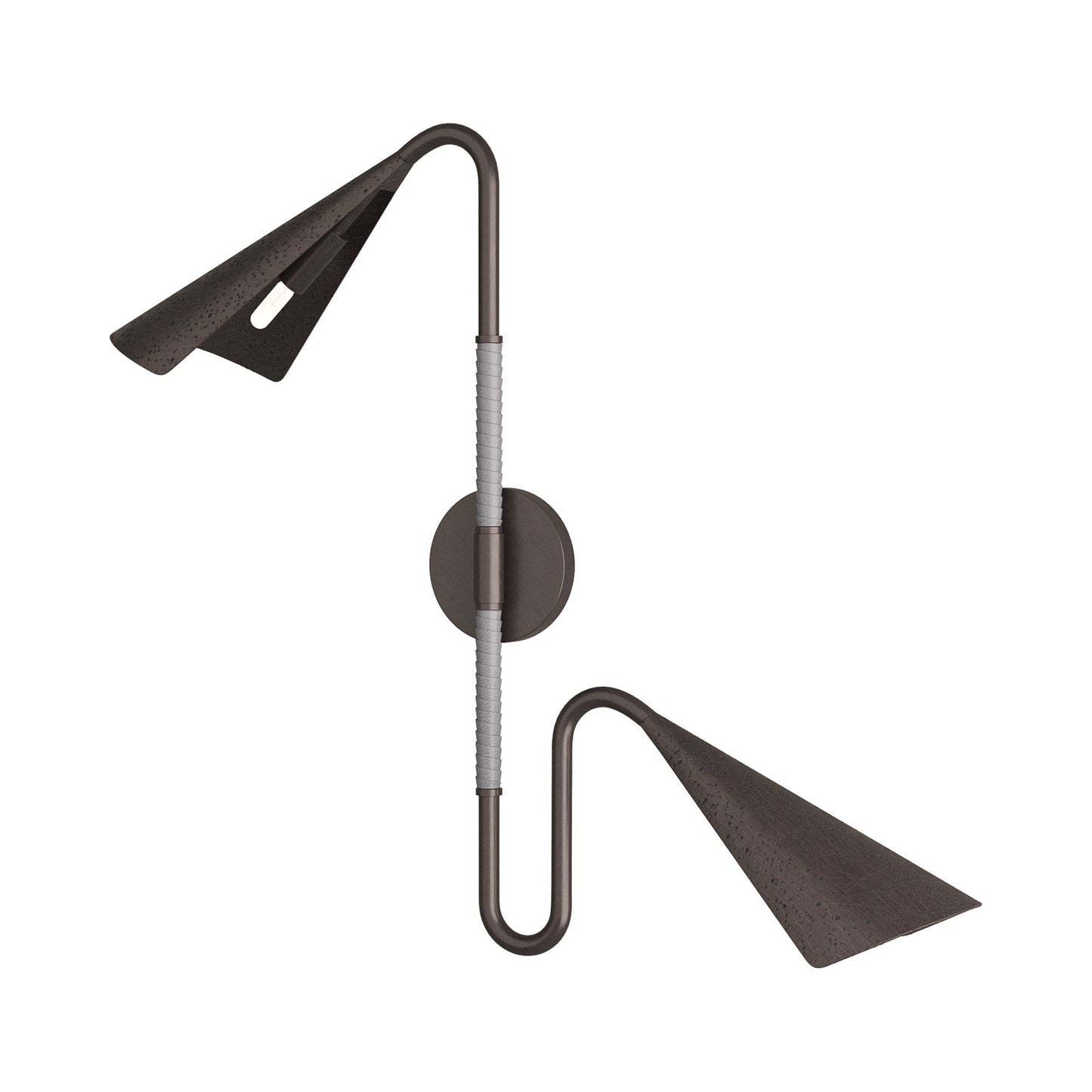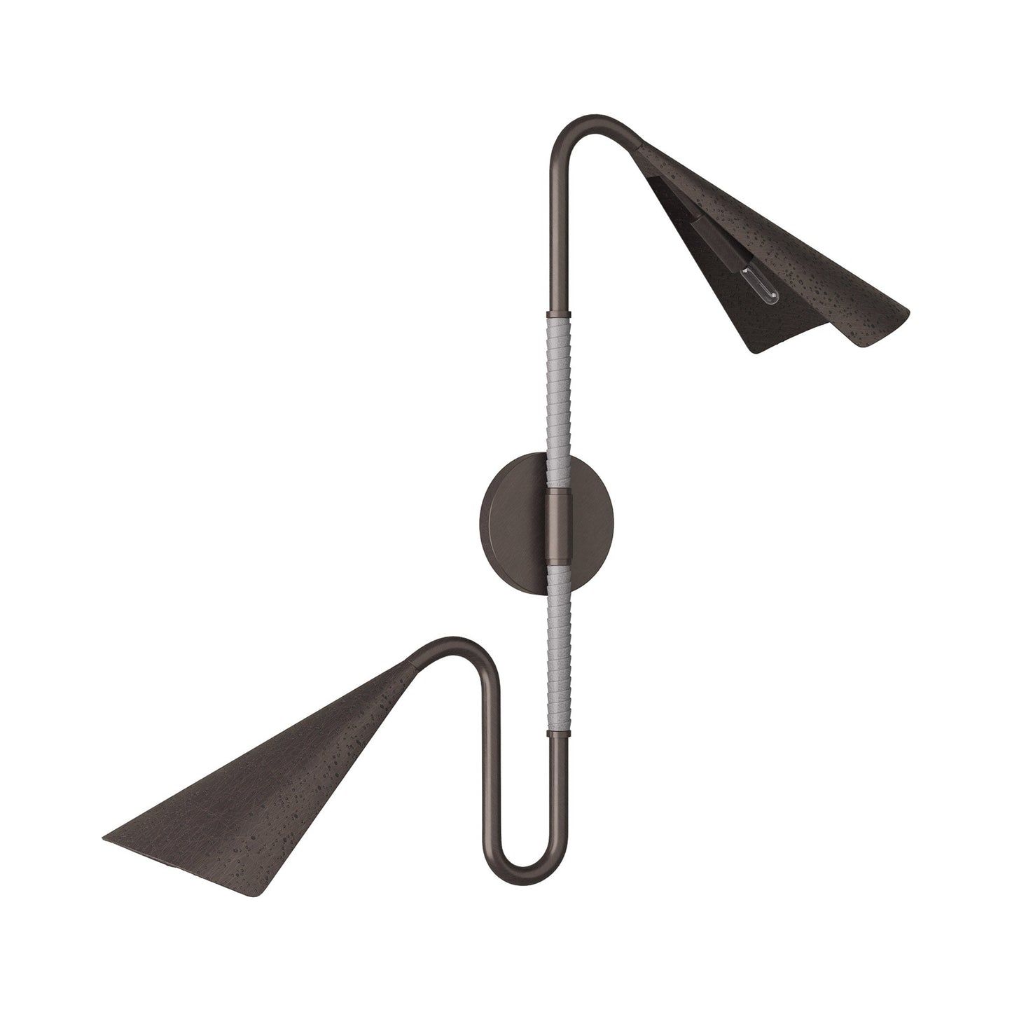 Prep for a dramatic response as the Amerson Wall Light from Arteriors punctuates contemporary décor with an energetic motif. Exquisitely shaped silhouetting works with an industrial vibe, creating a dual-light fixture with a slight studio design and Mid-Century Modern nostalgia. Symmetry and gritty materials merge to offer an exceptional aesthetic.