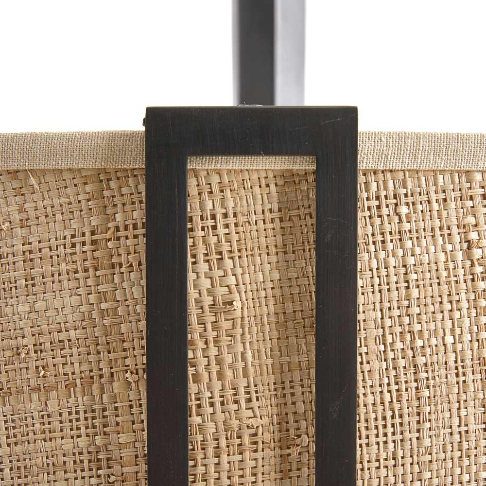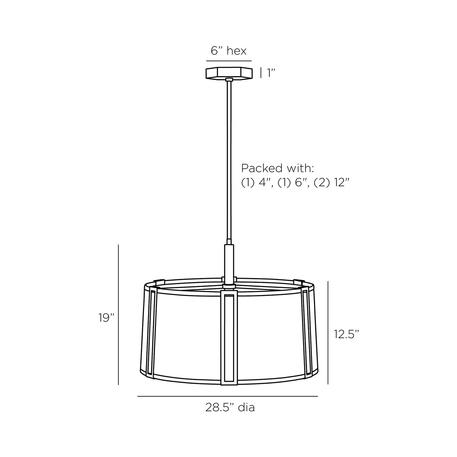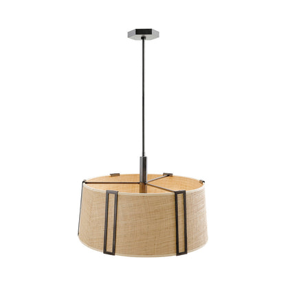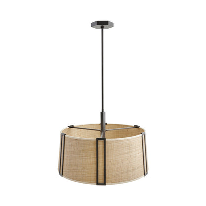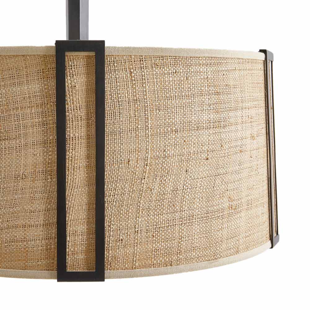 Earthy, natural charm appears in finishes and design elements in a light fixture with a mix of modern and industrial flavor. Metal framing and matching accents add a path to style as the Amida Chandelier from Arteriors softens the mood in a kitchen, dining room, or foyer, emulating an easy feel with natural grasscloth creating a tapered drum shade.