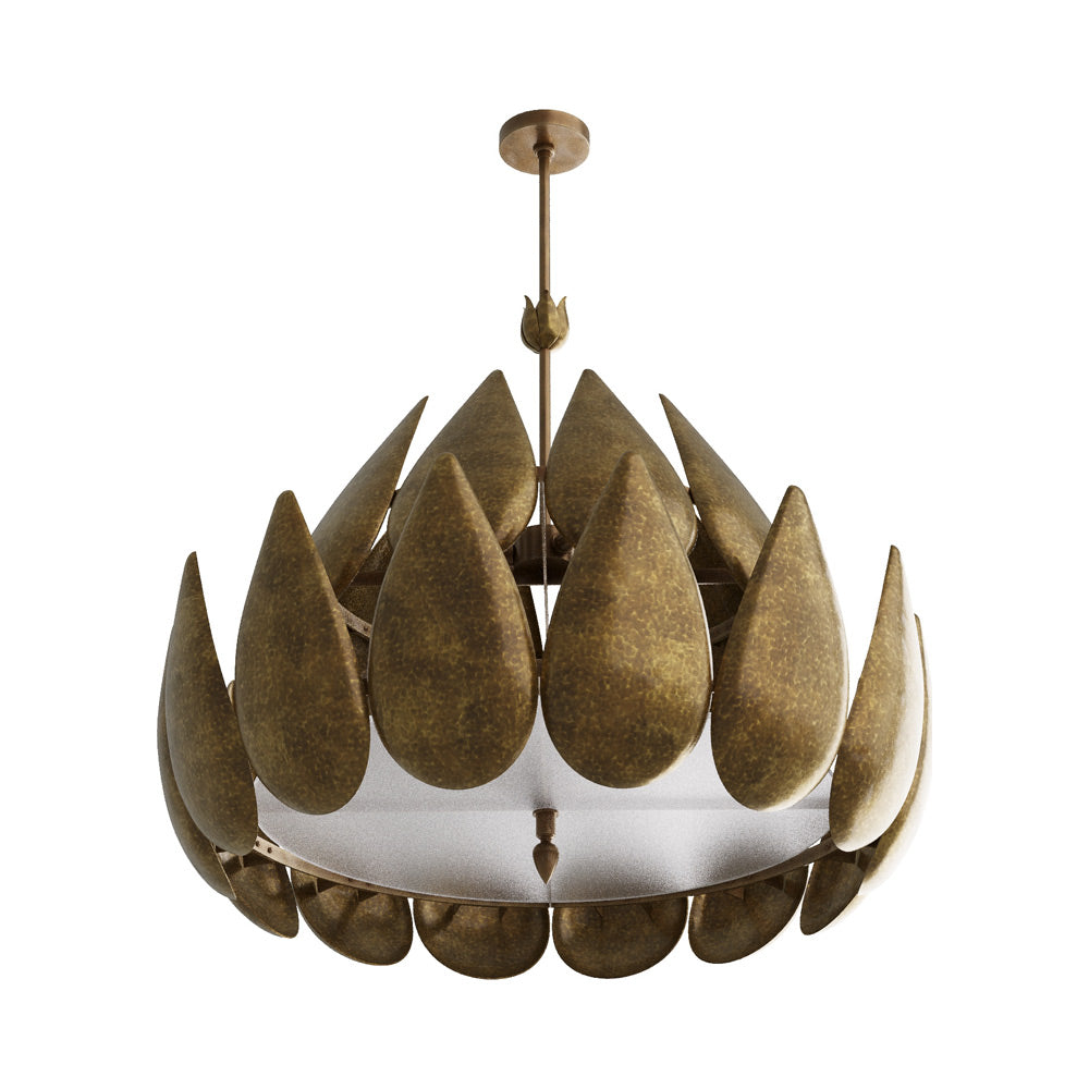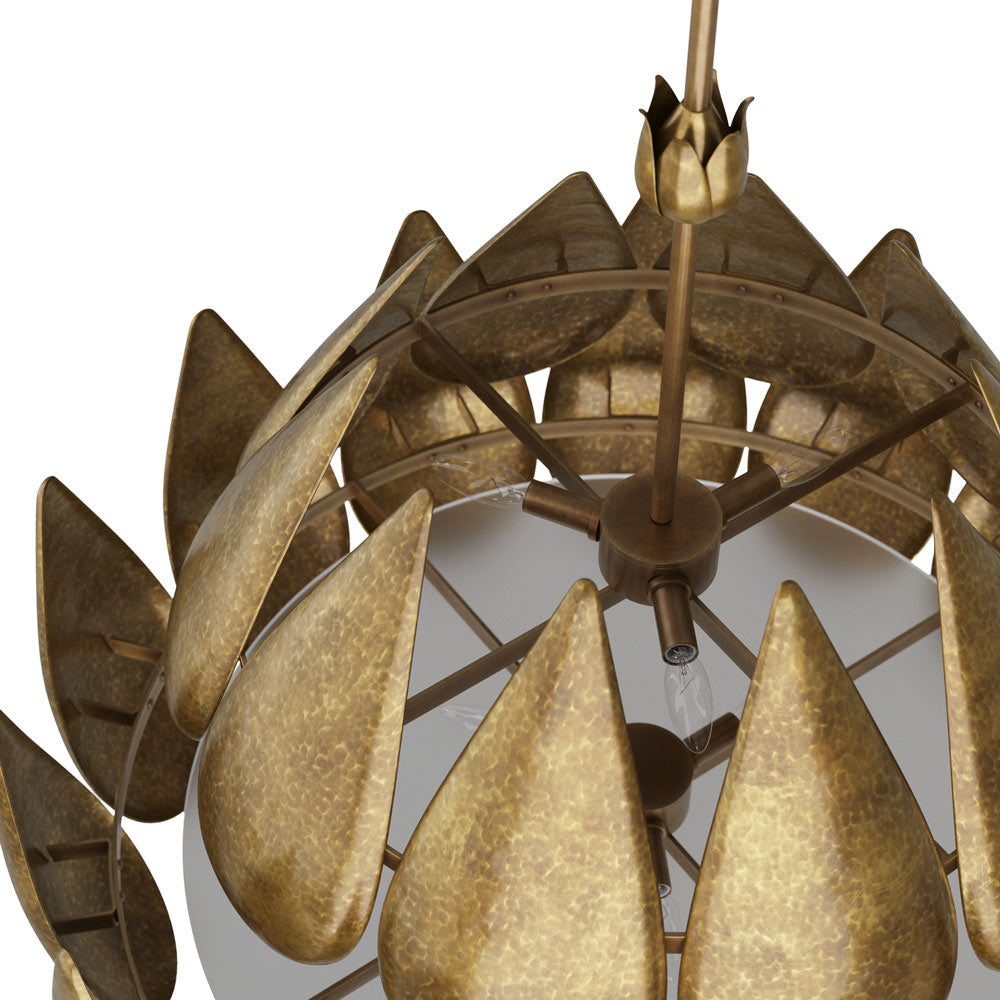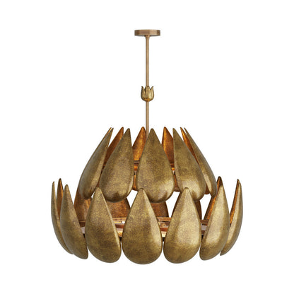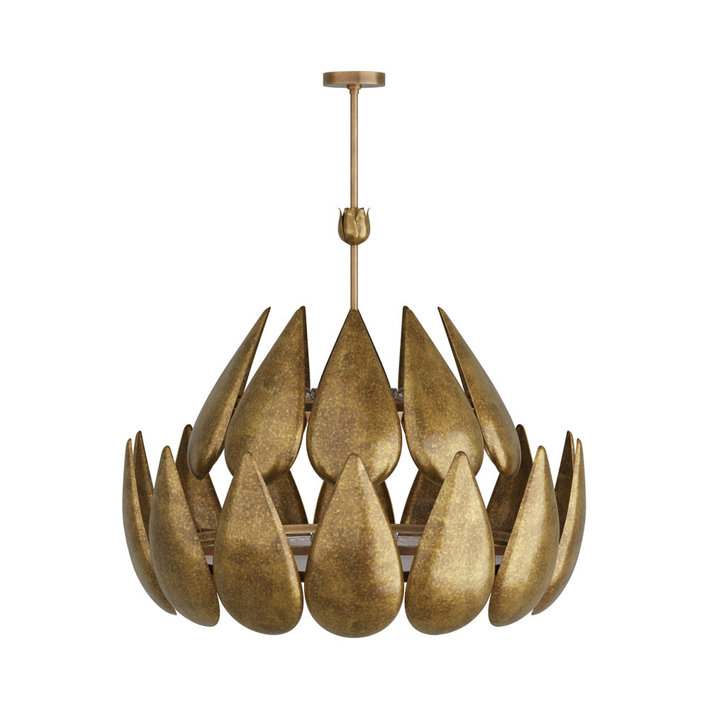 An example of sculptural artistry fitting for a custom space, the Anastasia Chandelier from Arteriors becomes a focal point in a kitchen, dining room, or entryway. A lotus-inspired silhouette captures botanical ambiance in a chandelier featuring layers of vintage brass metal with leaf-like shapes spaced sufficiently to send reflective and ambient lighting. Meet artistic objectives with the functionality of a fashionable light source.