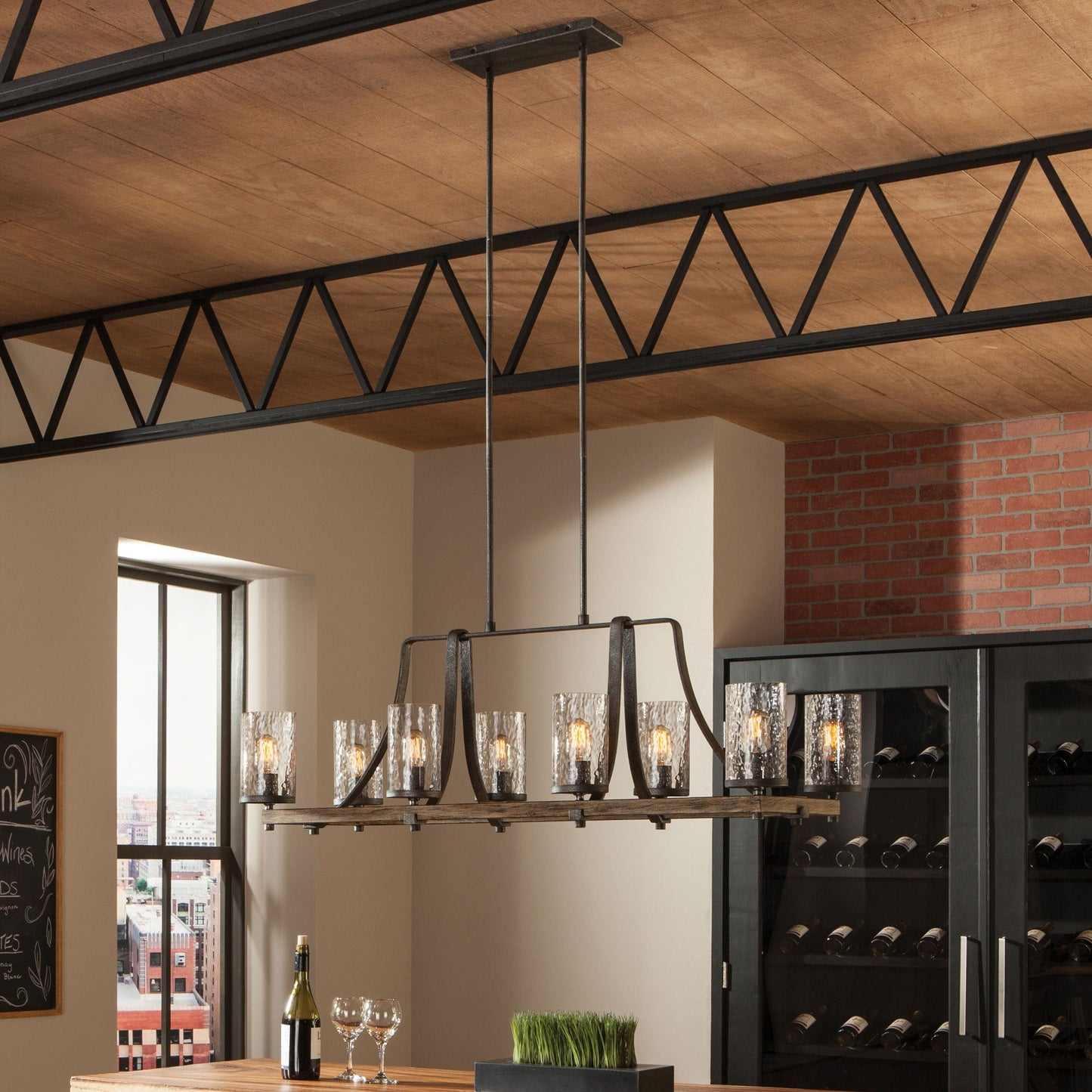 Textured glass cylinders bring a sophisticated hint to the farmhouse character of the Angelo Linear Pendant Light from Visual Comfort Studio.