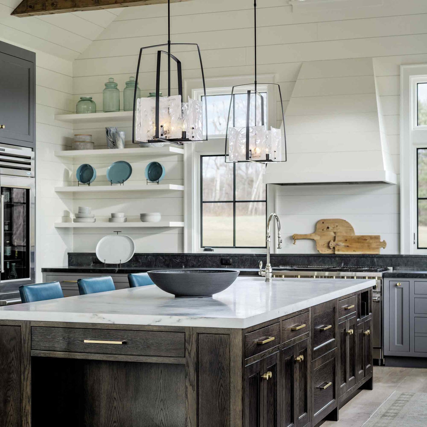 Hand-poured glass panels with subtle swirls create a striking, artisan look and feel for the Arc Pendant Light from Hubbardton Forge.