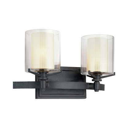 A French iron finish lends countryside character to the clean, layered hurricane shade featured on the Arcadia Bath Vanity Light from Troy Lighting.