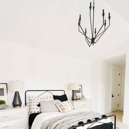 When we happened upon a breathtaking avant garde Modernist candelabra, we were determined to resurrect it as a chandelier and sconce with electric lamping. The ensuing process was a labor of love, as we sought to establish balance in a purposefully asymmetrical fixture and create the illusion of continuity. Transforming the piece from a sculptural base for wax-and-flame candles to an electric fixture, we continued our brand tradition of keeping the bobeches and making the candle sleeves the same finish as the rest of the piece.