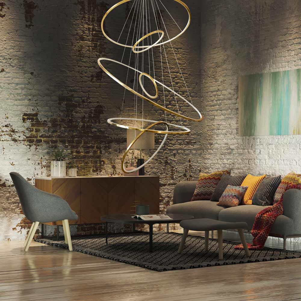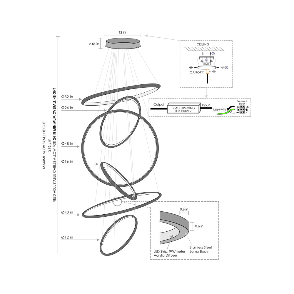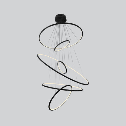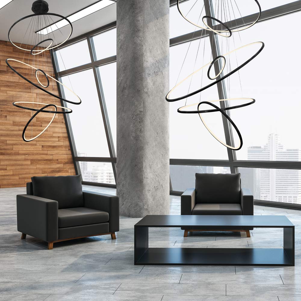 Create a gorgeous cascade of glowing rings with the impressive Aria Vertical LED Chandelier from Avenue Lighting. Beautifully modern, the fixture features glowing, energy efficient concentric rings that arrange in various positions and heights to create a piece that's unique to your space and style. A stunning piece over a staircase or in a sophisticated foyer.