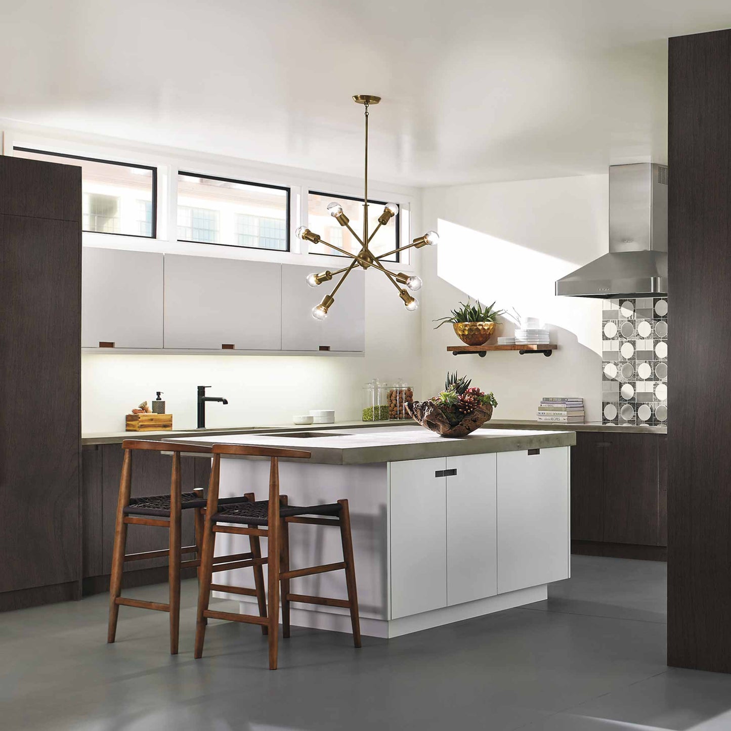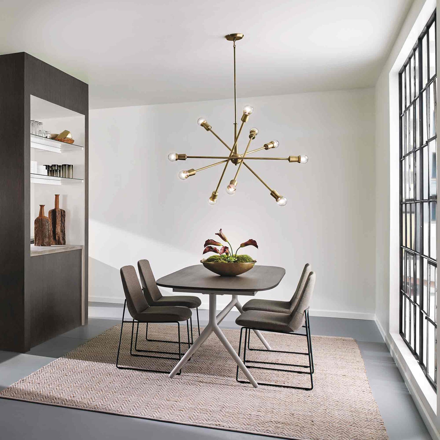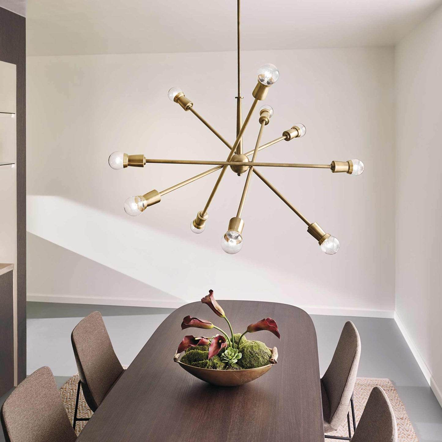The Armstrong Chandelier features a "sputnik" design with adjustable arms, allowing you to customize the light horizontally or vertically for just the right look. The Armstrong chandelier is perfect in contemporary or mid century modern environments.