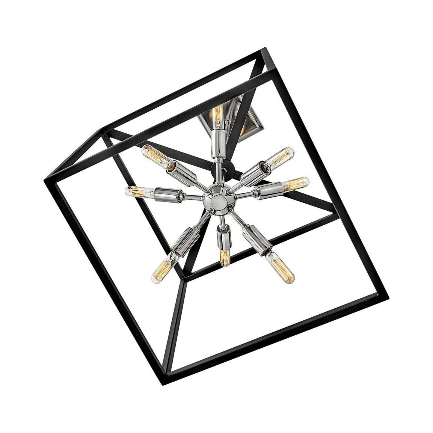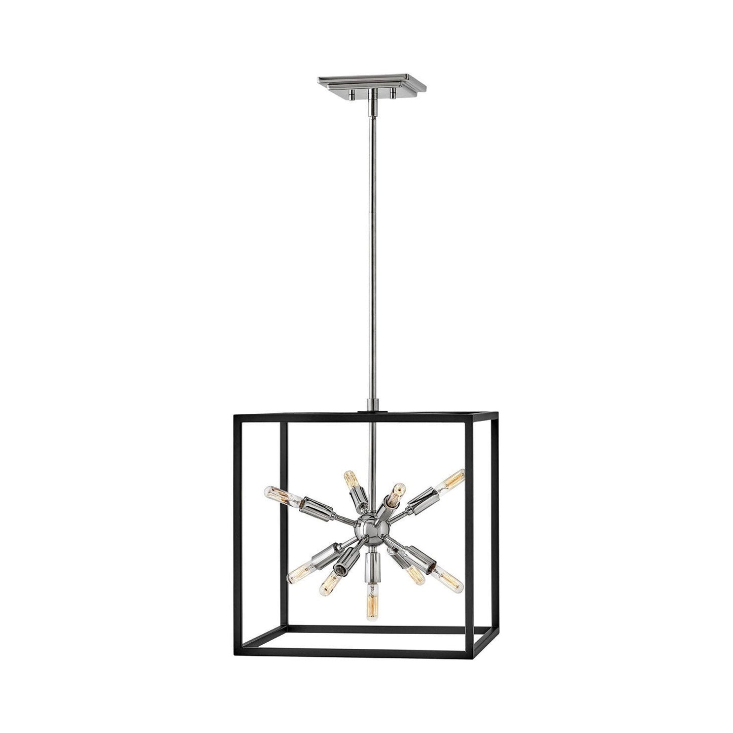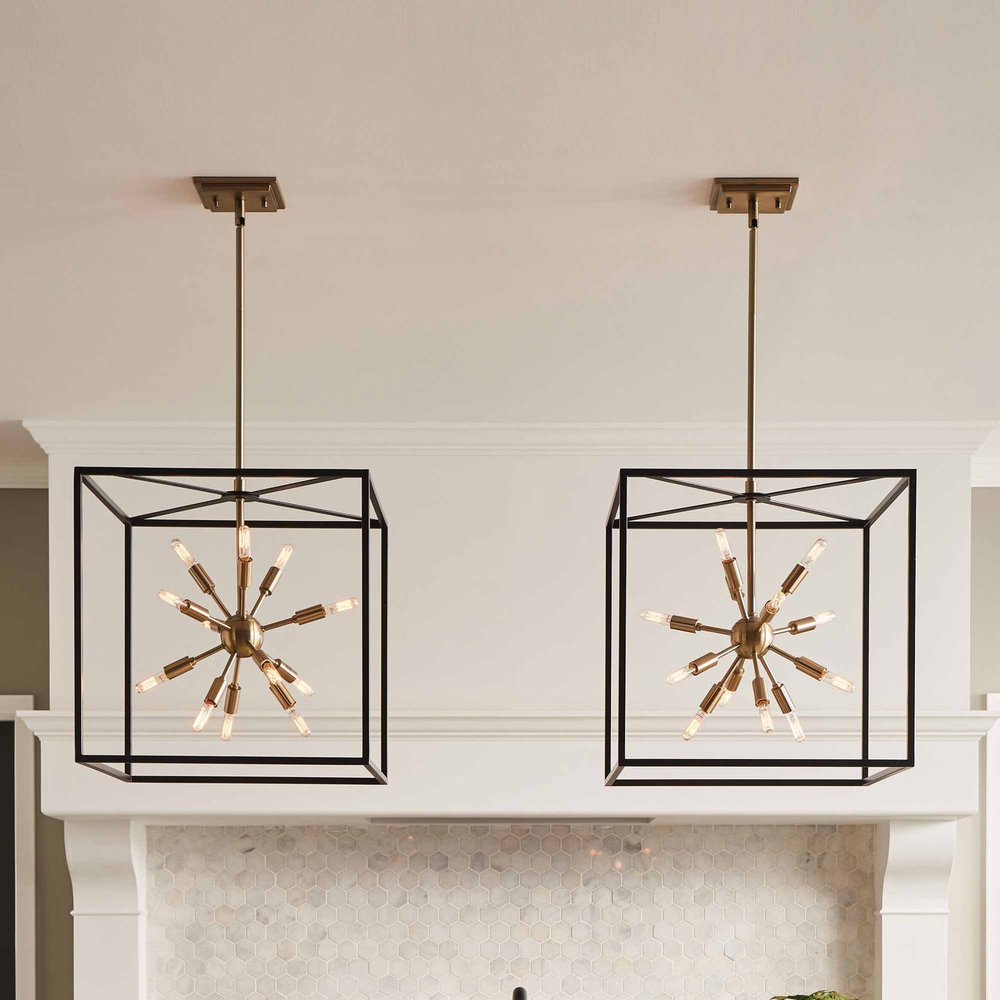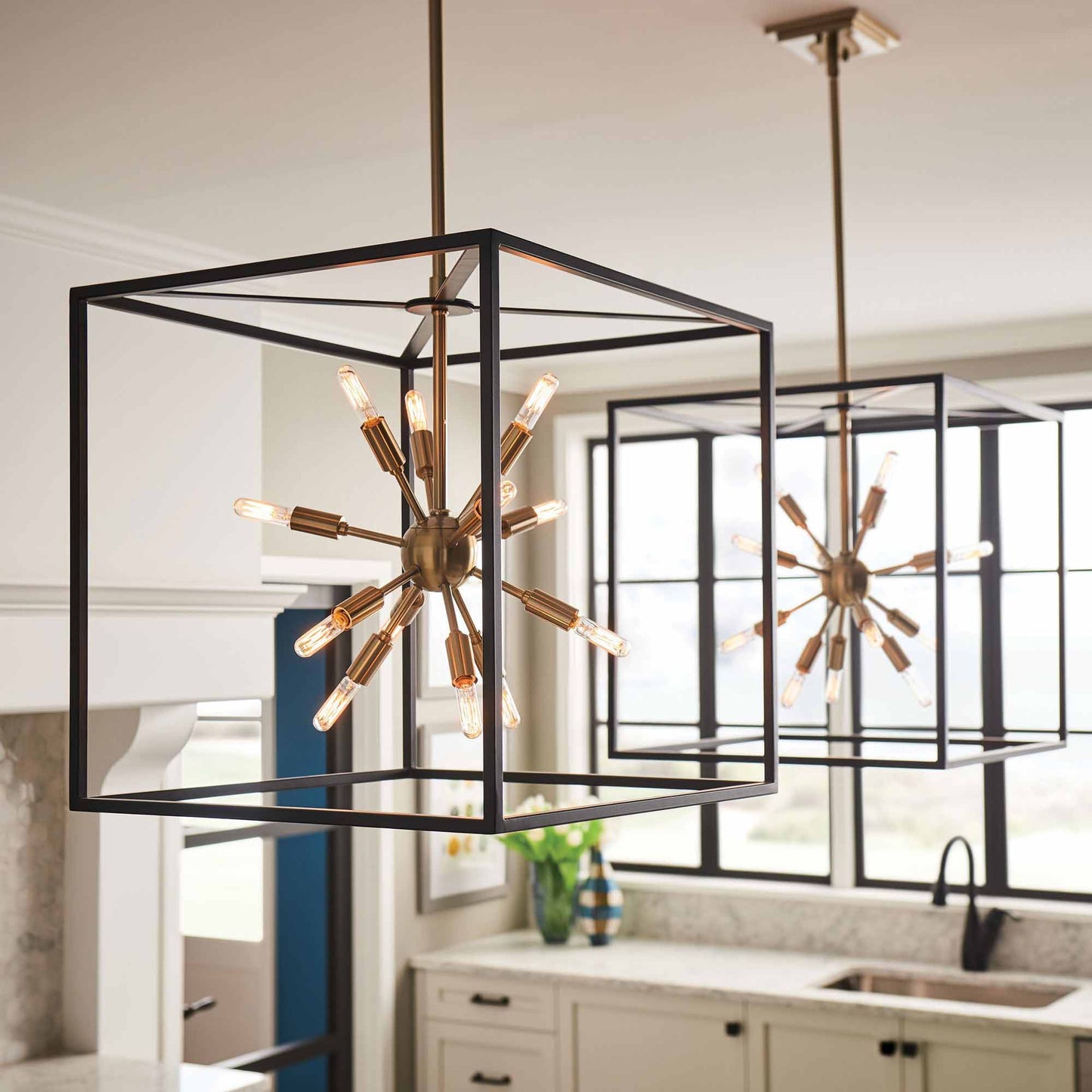 Some views are better than others. The striking Aros pendant showcases a provocative mid-century modern starburst cluster in a luxurious warm brass or polished nickel framed by an articulating, angular cage in prominent black. For added drama, the sophisticated pendants dazzle with dimension to fill unique spaces or higher ceilings. Aros is part of the Lisa McDennon Collection.