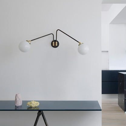 Create a festive atmosphere in a modern space with the Array Twin Opal Wall Light from CTO Lighting. The whimsical look of globe shades delivers a prominent element to this light that borrows from old studio style and improves on it with modern adjustability. Metal accents include satin brass details and bronzing, both of which pay tribute to a vintage Hollywood feel.