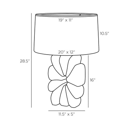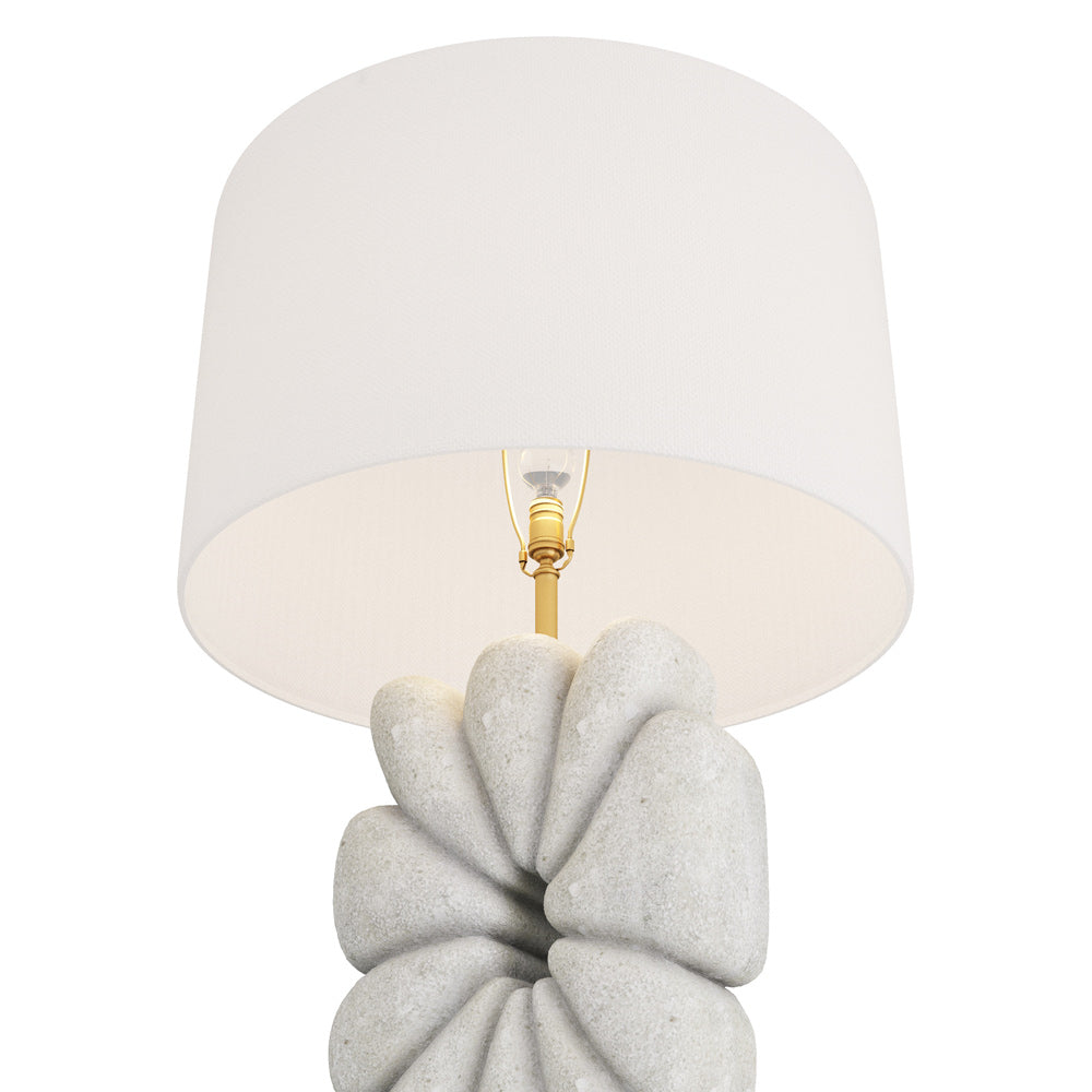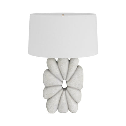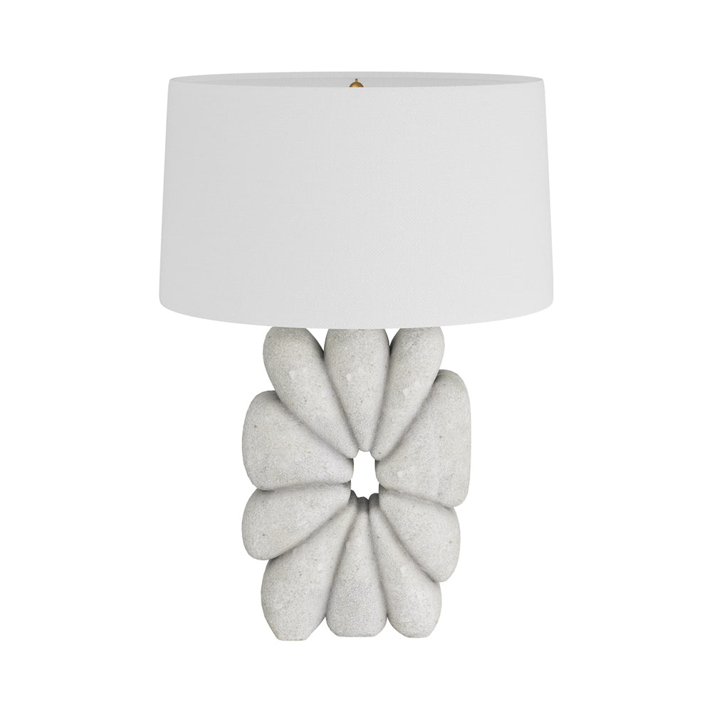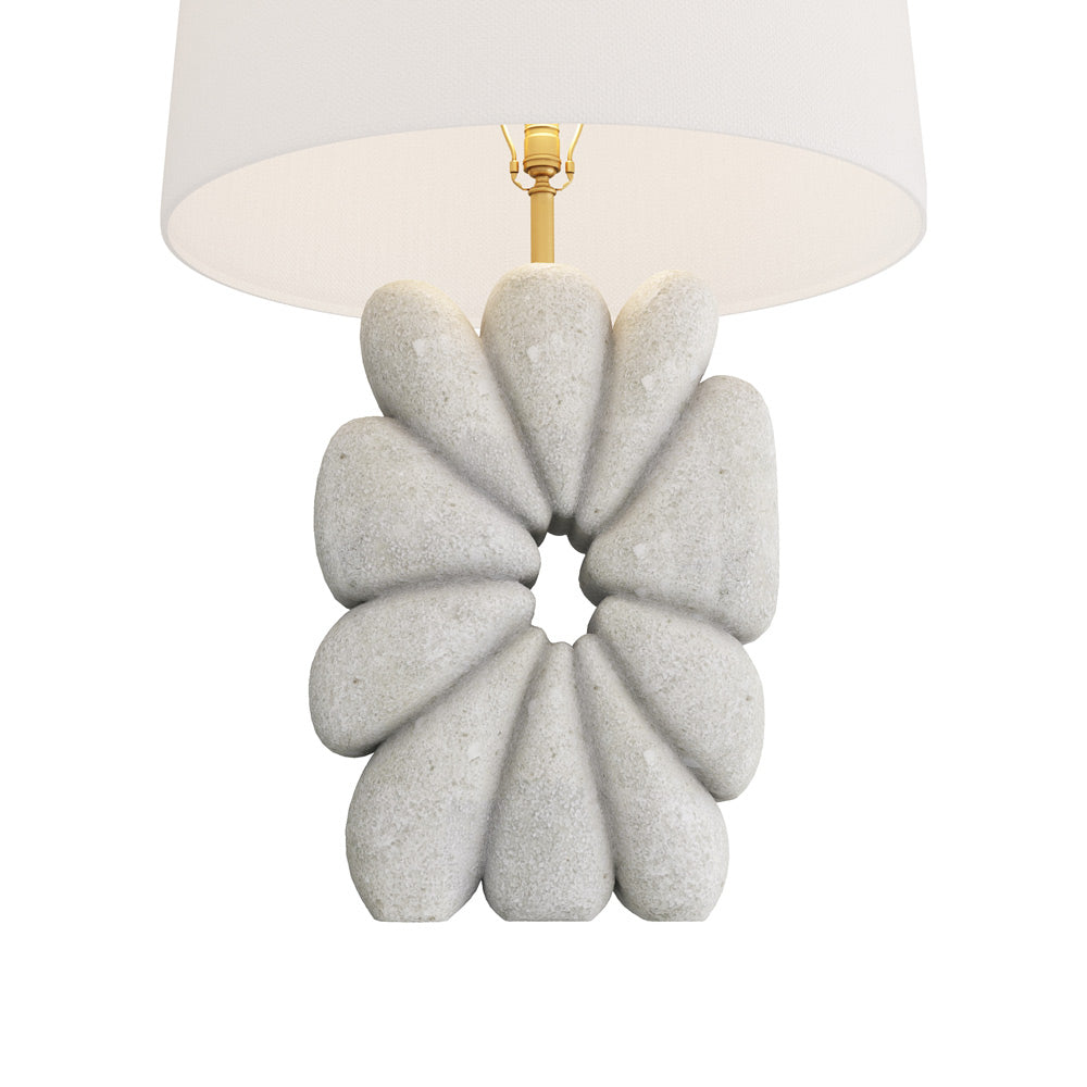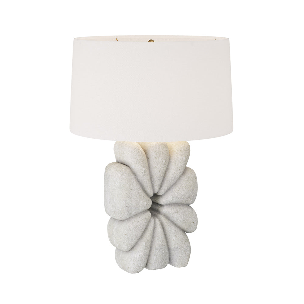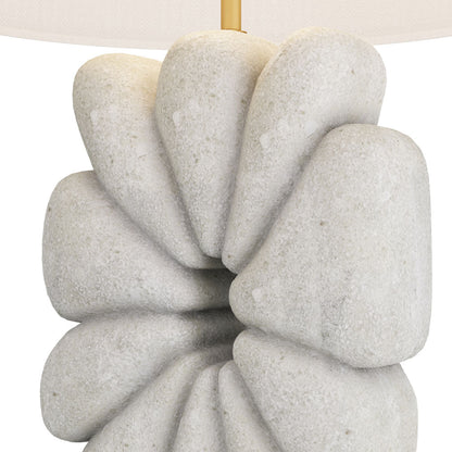 Natural and organic design elements create a delightful look as the Ashley Table Lamp from Arteriors is versatile with a perfectly neutral palette. Ivory glass stone composite petals form a definitive blossom silhouette, textural and aesthetically beautiful. Metal hardware and a conventional shade complete the decorative look of a lamp bringing soft lighting to bedrooms and living spaces.