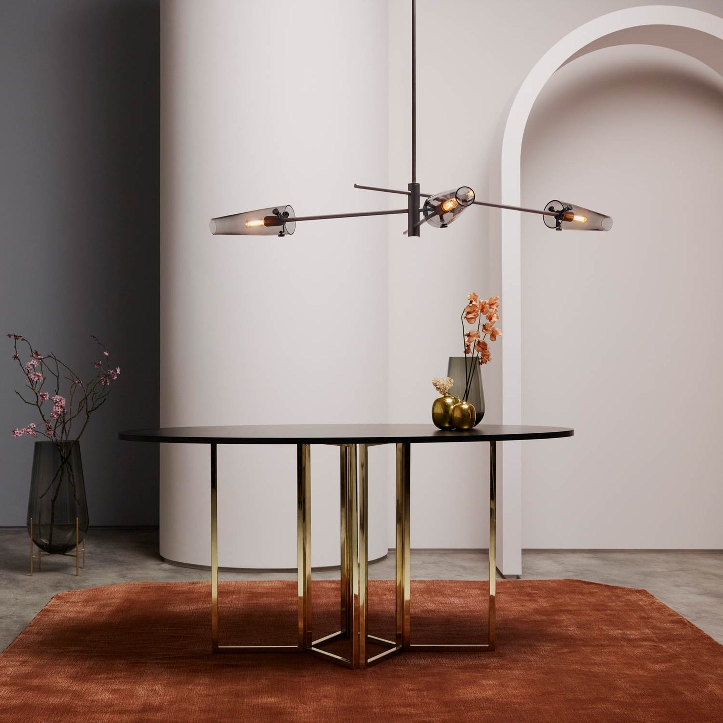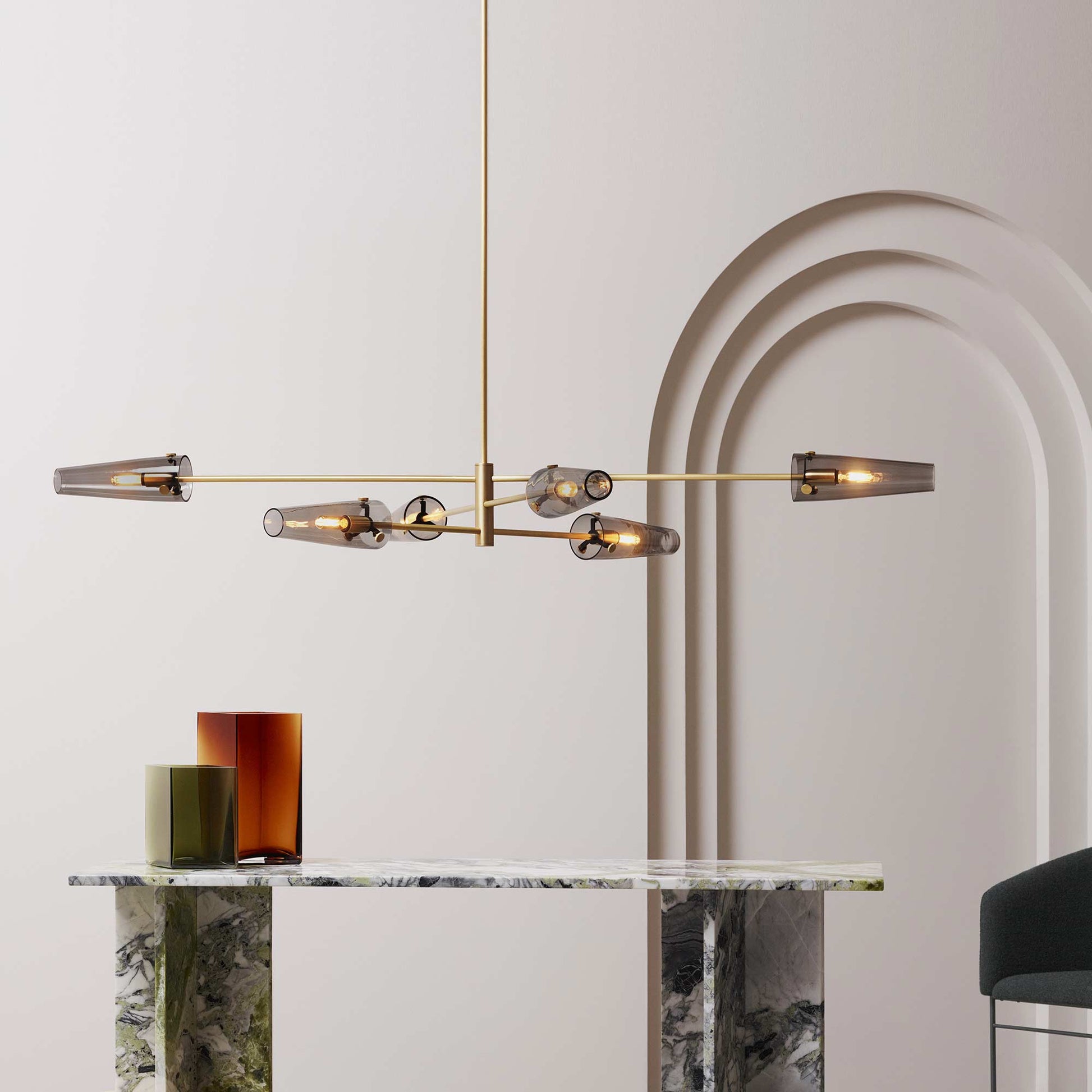 A captivating study in plane geometry awaits the interior designer choosing the Axis Pendant Light from CTO Lighting as a source of ambient, energy-efficient lighting. Go with a futuristic space-inspired motif, embracing conical smoked glass shades capping slender arms that rotate to create customized lighting effects.