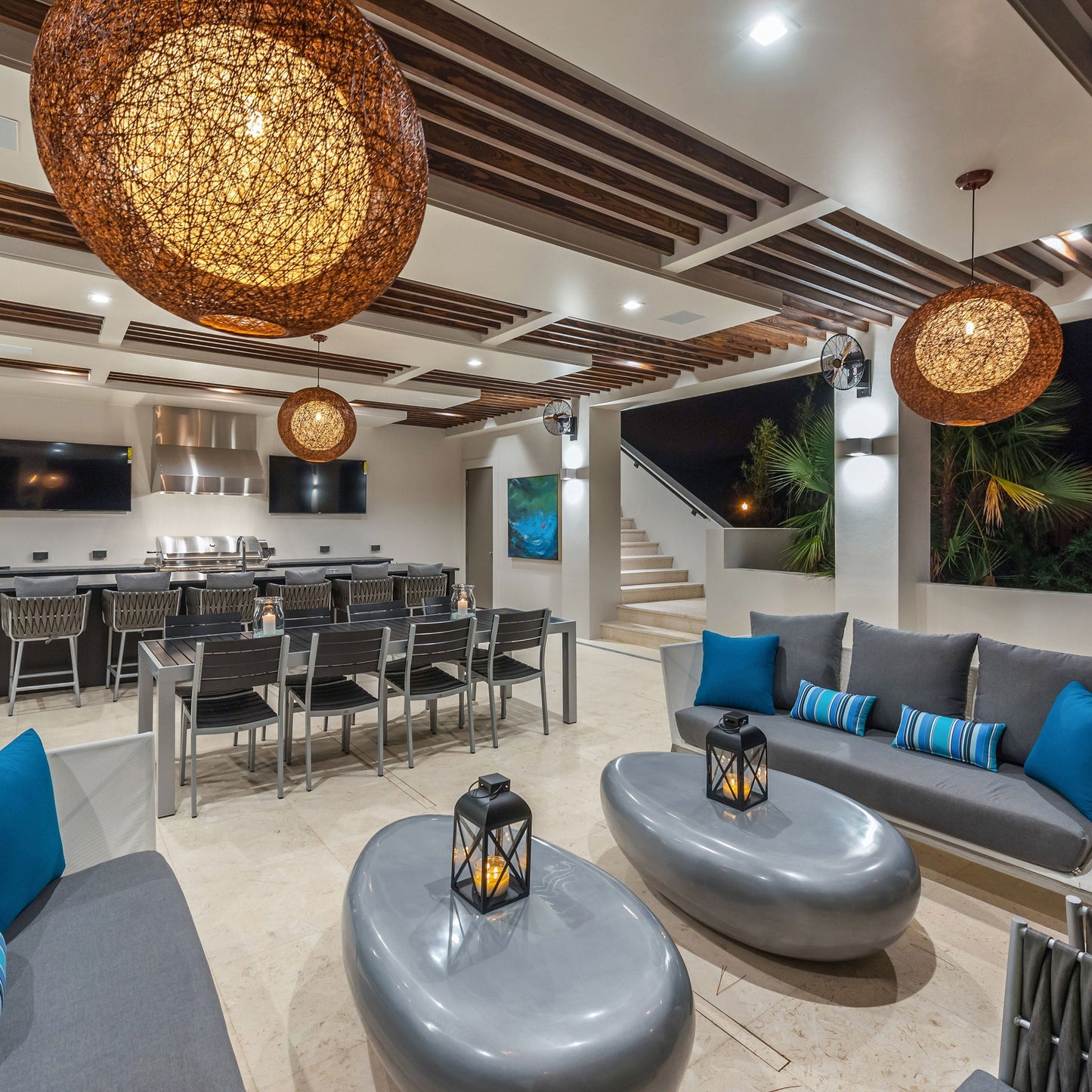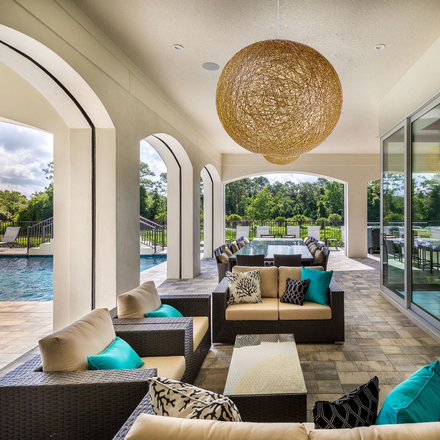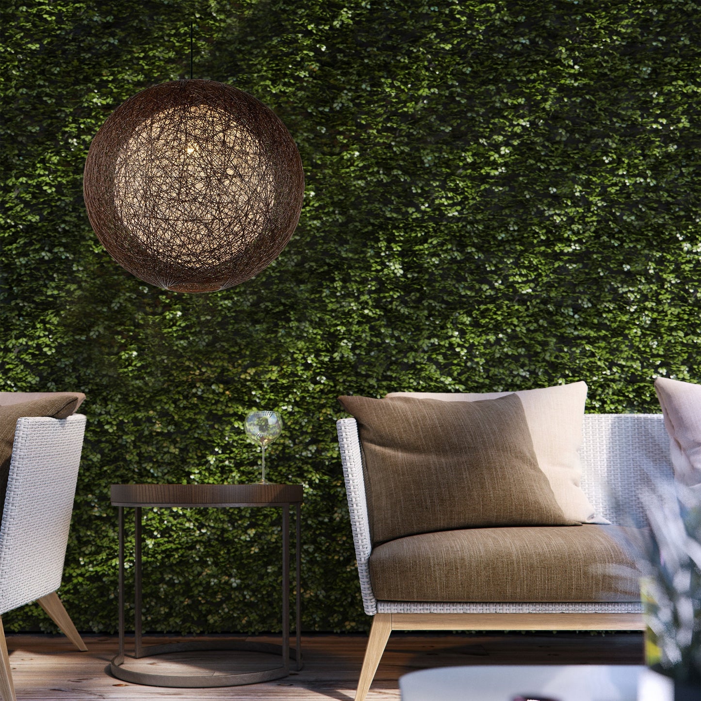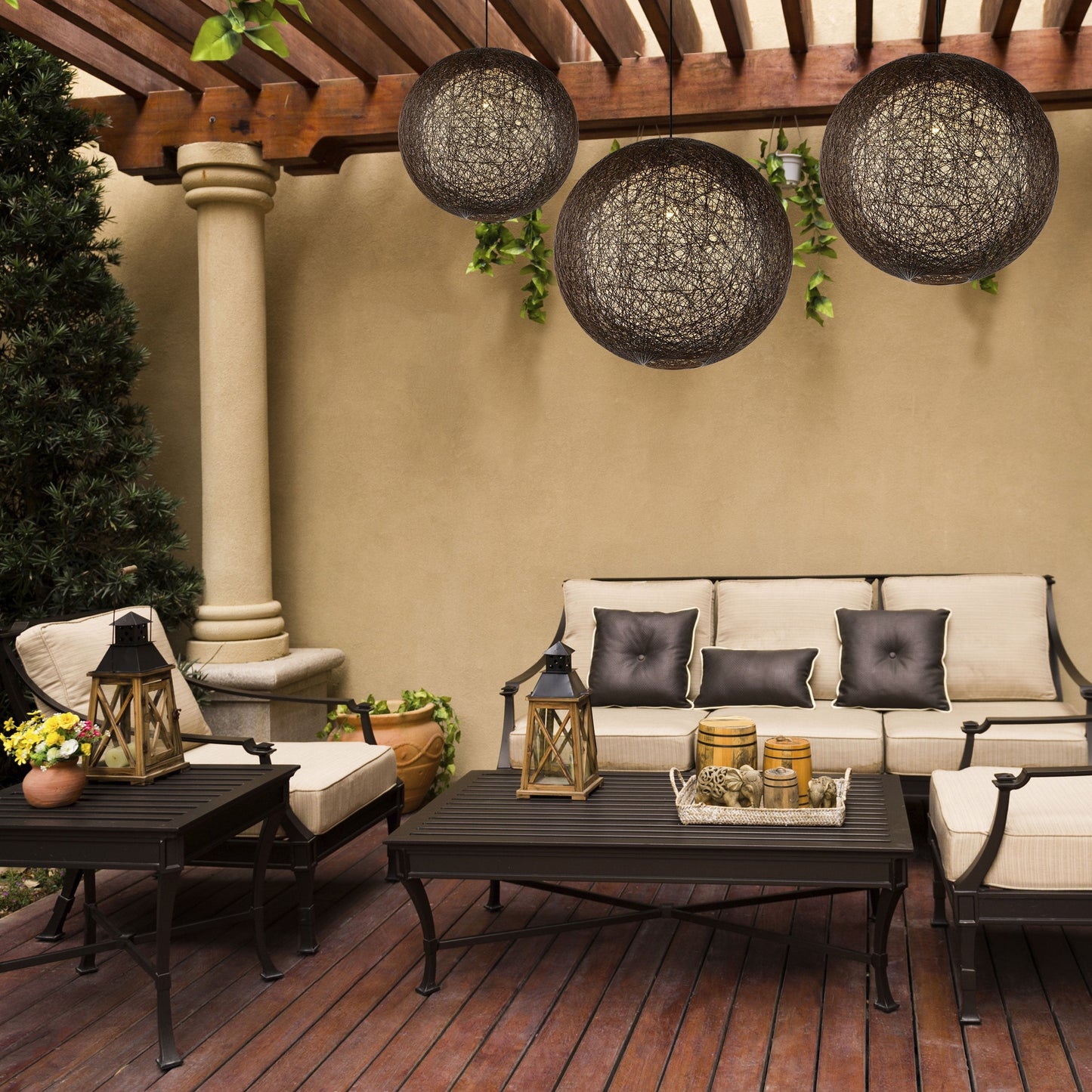 Spherical dual shades constructed of woven string in two tone finish combinations, Natural with White inner and Chocolate with White inner. Shades are treated for weather resistance and are U.L. approved for damp location which make them perfect for outdoor living spaces.