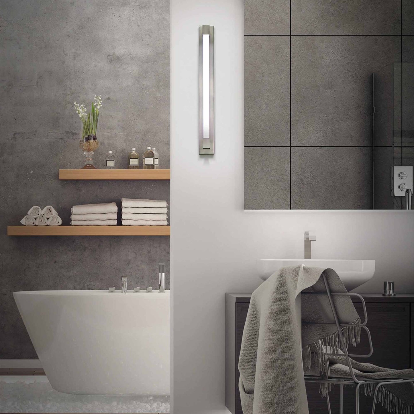 A minimalist yet bold bath luminaire that deploys robust, flattering illumination above or alongside a vanity in residential, hospitality and commercial environments.