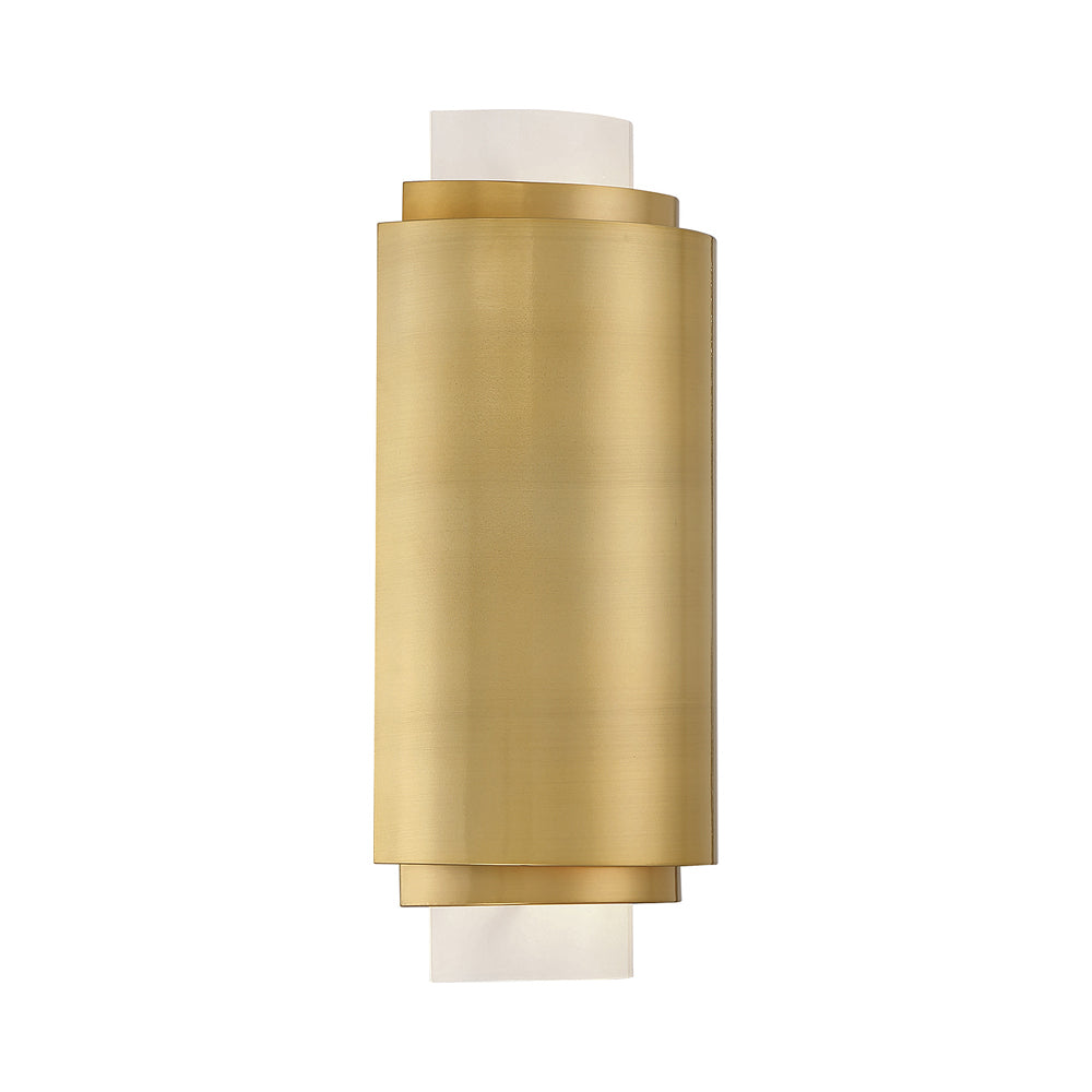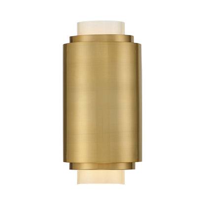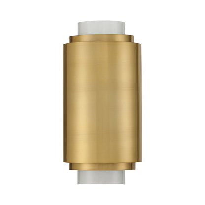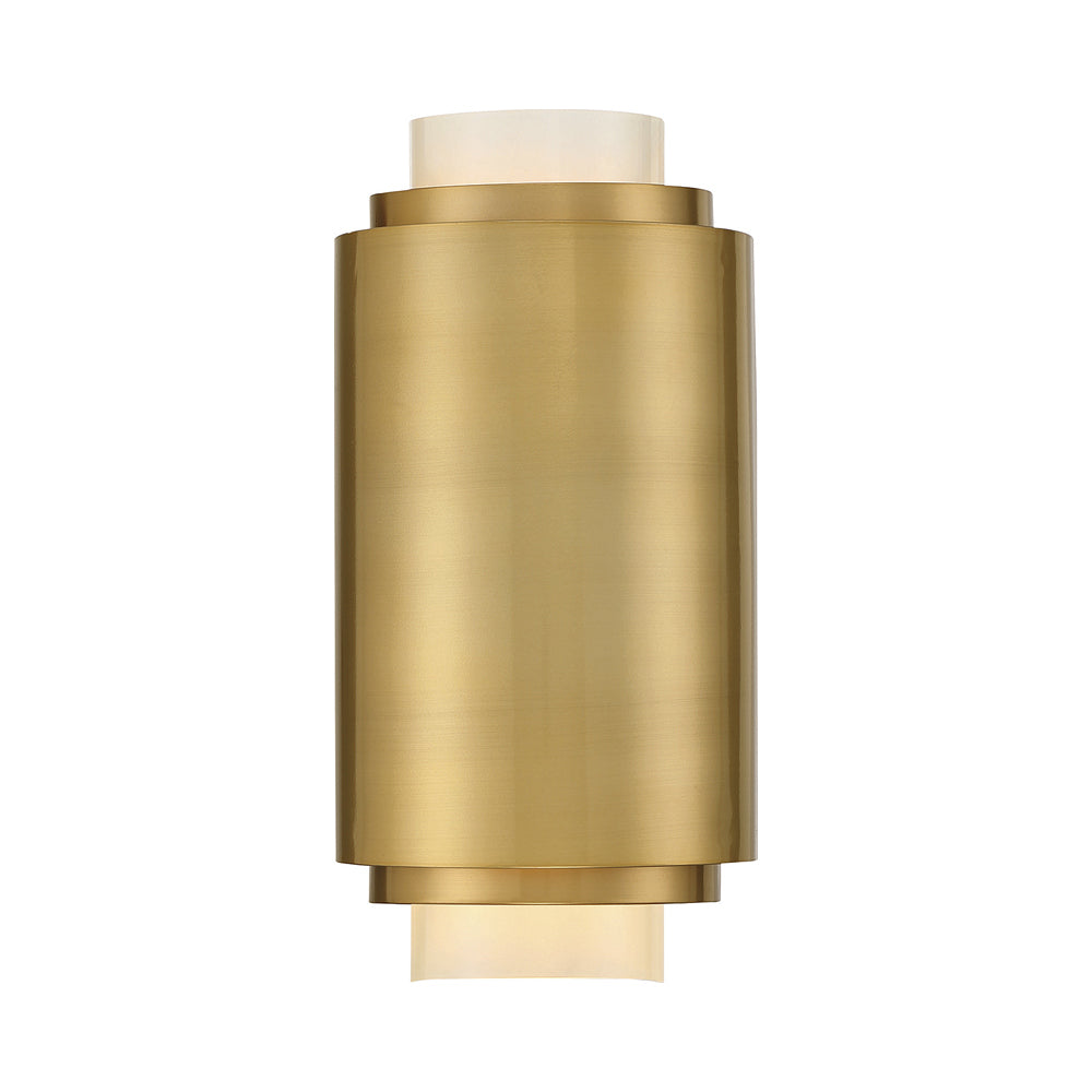 Back to basics with the Beacon Wall Light from Savoy House, a tasteful fixture echoing Art Deco vibes in a layered configuration. Choose this fixture with perfect versatility and a rounded burnished brass finish metal frame. White frosted glass accents direct lighting upward and downward, creating soft, glowing ambiance.