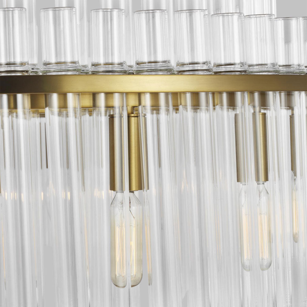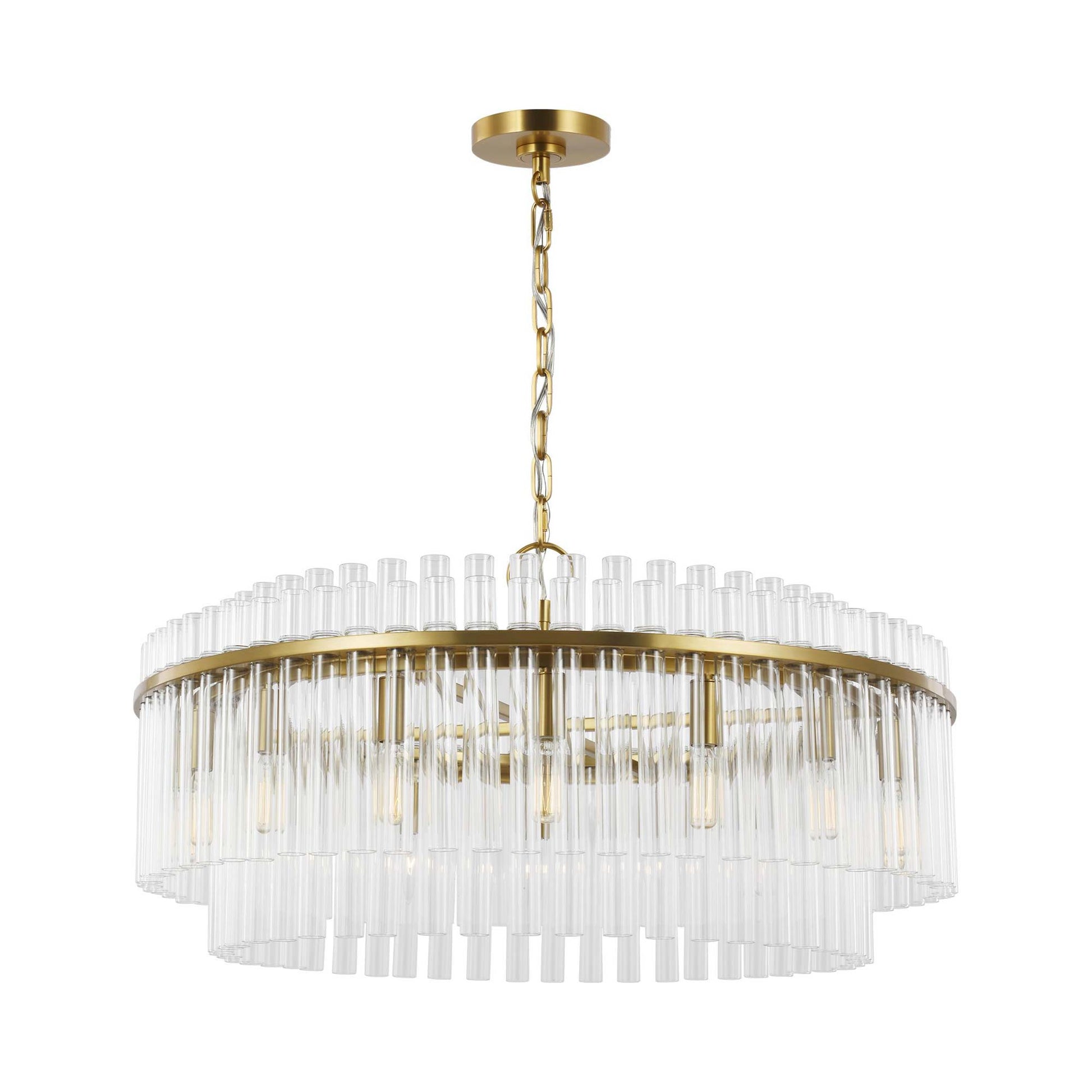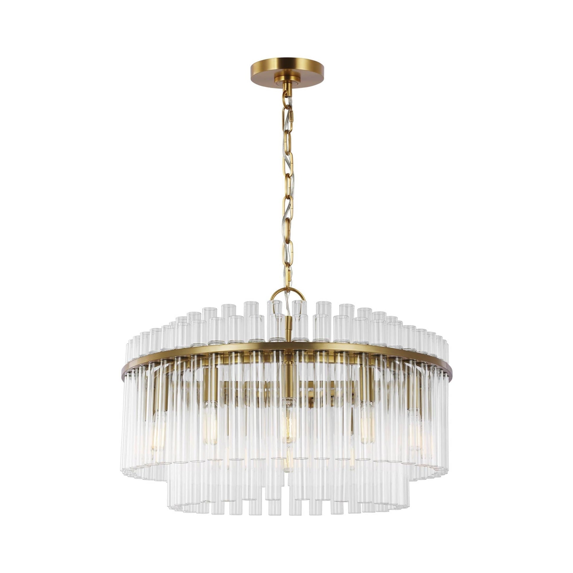 Tiers of glass tubes sparkle as they refract the light from within the Beckett Chandelier from Visual Comfort Studio. A traditional look perfect for a dining room or entry, the chandelier is simple and sophisticated, perfect for glam flair.