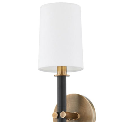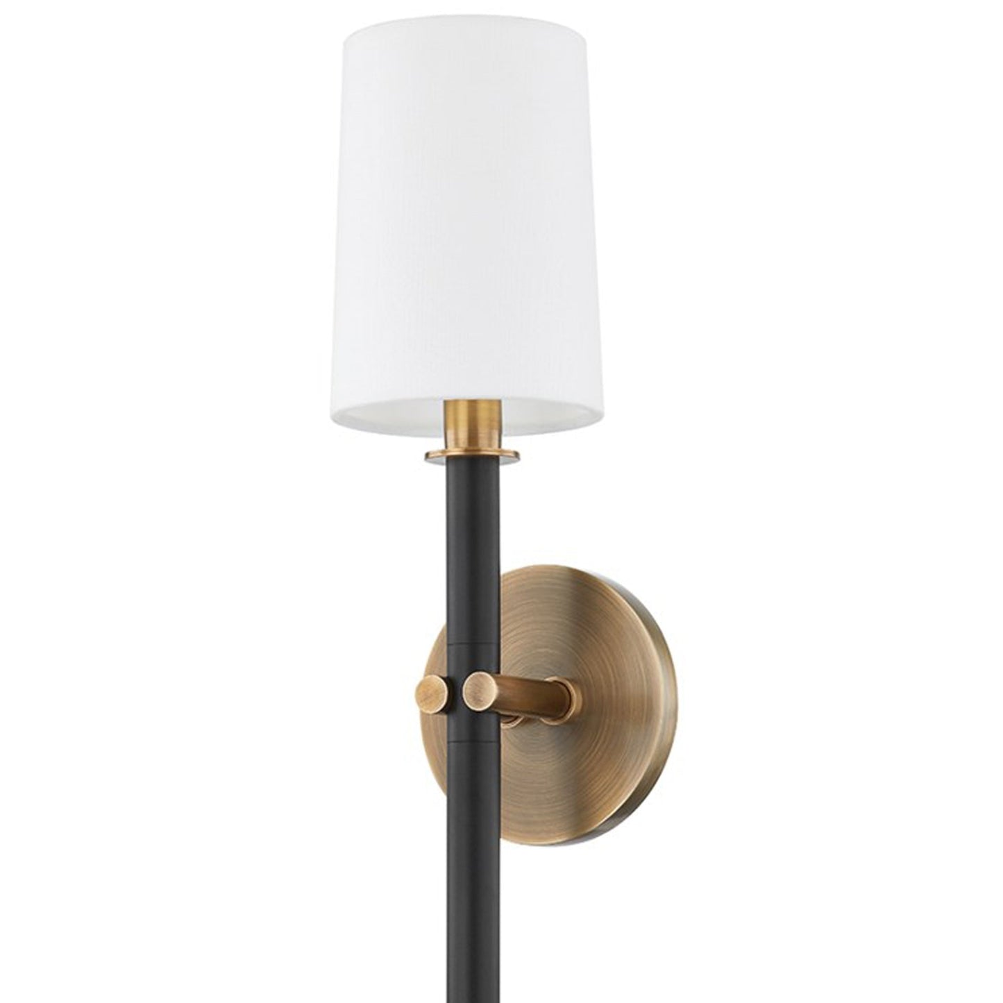 Simplicity drives the design narrative of a tasteful light source with a blend of Mid-Century Modern and Art Deco influence. The Belvedere Wall Light from Troy Lighting keeps it basic yet stylish with a candlestick frame fashioned of textured black finish metal clutched by ornate pegs protruding from a lush patina brass wall plate. Add a slender white shade and watch the versatility open up creative options for coordinating with casual design schemes.