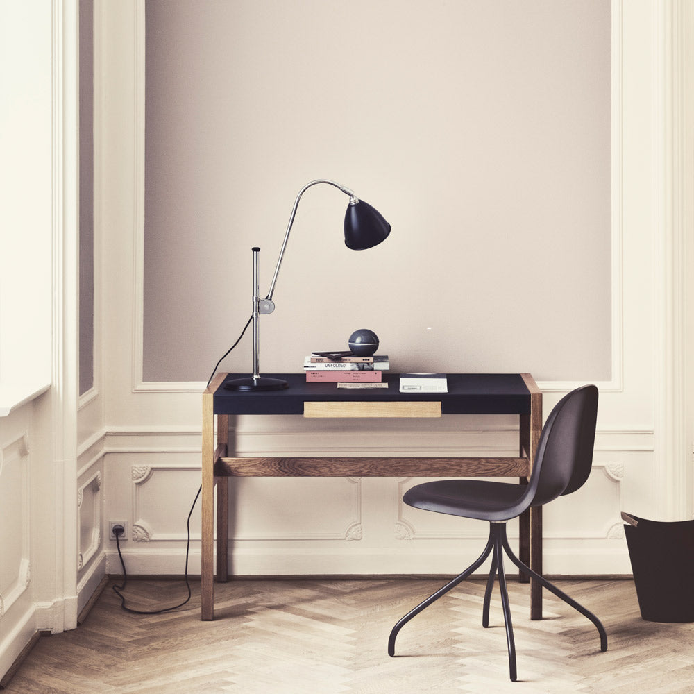 Sync a space with a festive look in source lighting inspired by industrial and vintage charm. The Bestlite BL1 Table Lamp from Gubi plays spectacularly with familiarity, boosting its asymmetrical silhouette with greater spacing and updated elements. A black semi-matte shade and base blend fabulously with chrome finish metal framing, adding an arched stem that embellishes its fun shape.