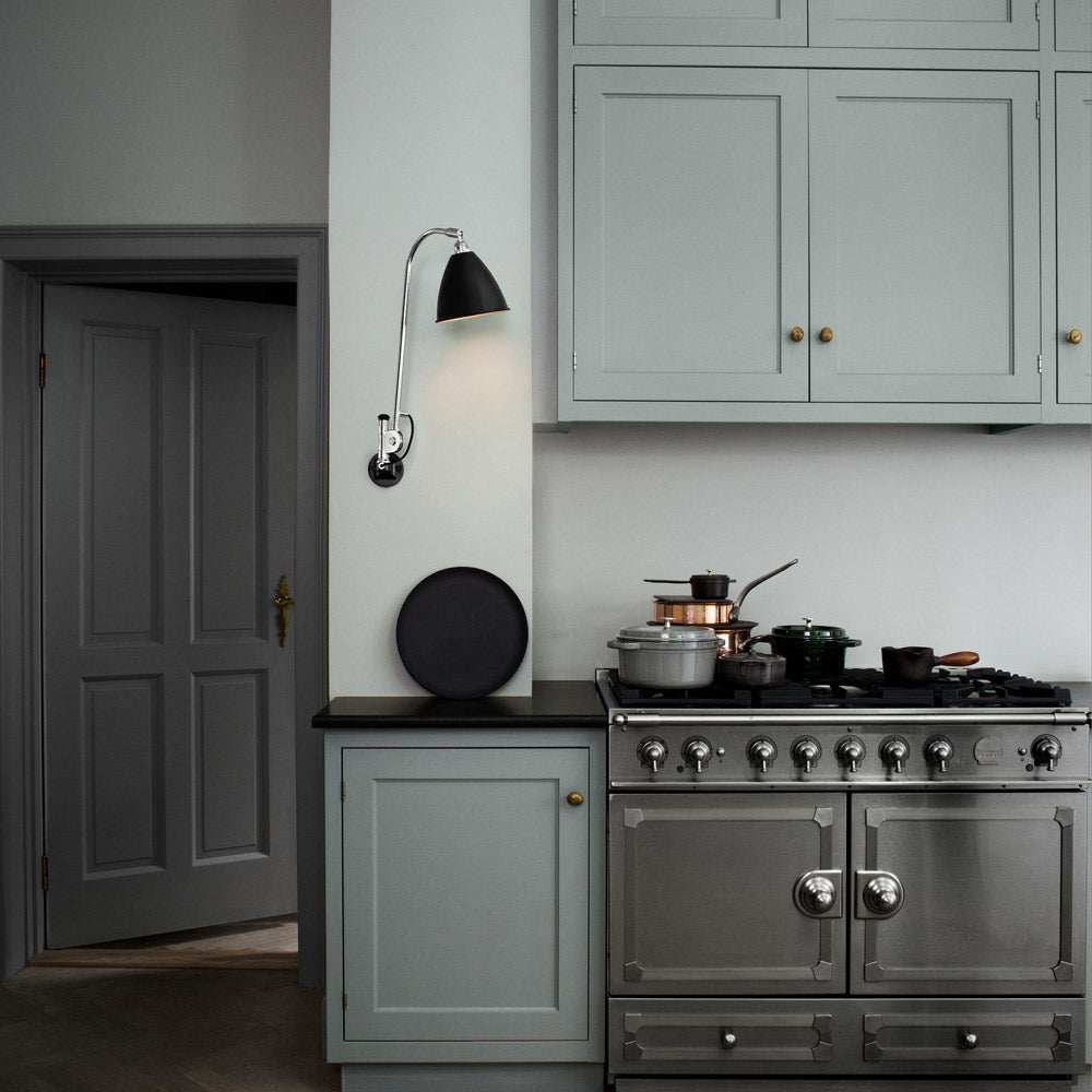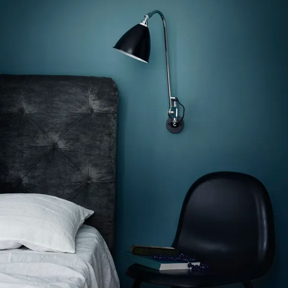 A crisp utilitarian aesthetic blends industrial influence with a more elegant look as the Bestlite BL6 Wall Light from Gubi pulls off both functionality and high style. Recreating a retro-inspired banker’s motif, this wall light delivers subtle curves and mechanical-like elements, diffusing light with a black semi-matte metal shade and adding adjustability for custom lighting with a gleaming chrome finish metal frame.