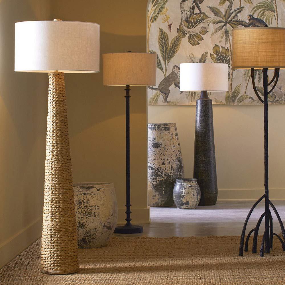Explore the tasteful look of sophisticated coastal fare in a lamp with equal parts versatility and exotic personality. The Birdsong Floor Lamp from Currey and Company lifts the easy-living feel in a casual space with exotic natural tone water hyacinth woven into a conical body and matching finical. A classic fabric drum shade provides perfect light filtering.