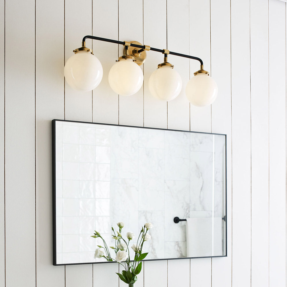 Touched with industrial charm, the Bistro Bath Vanity Light from Visual Comfort Signature sports a chic two-tone finish. Globe shades add mid-century character while enlivening your vanity.