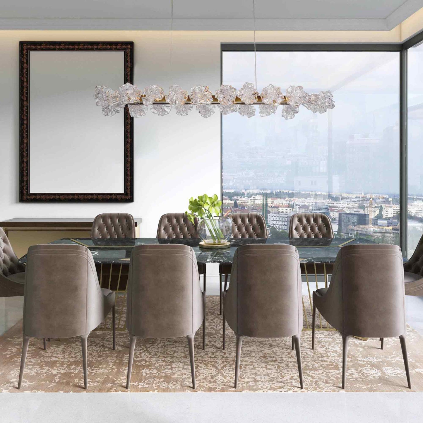 Embellish a custom contemporary space with the energy-efficient Blossom LED Linear Pendant Light from Hammerton Studio. Emulating frosty glass sculptures, its abstract blown glass shades collect along a linear metal frame and suspend from a matching metal canopy.