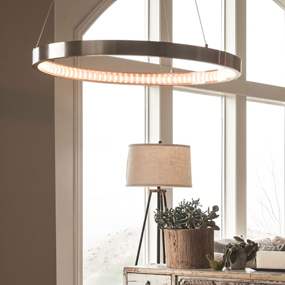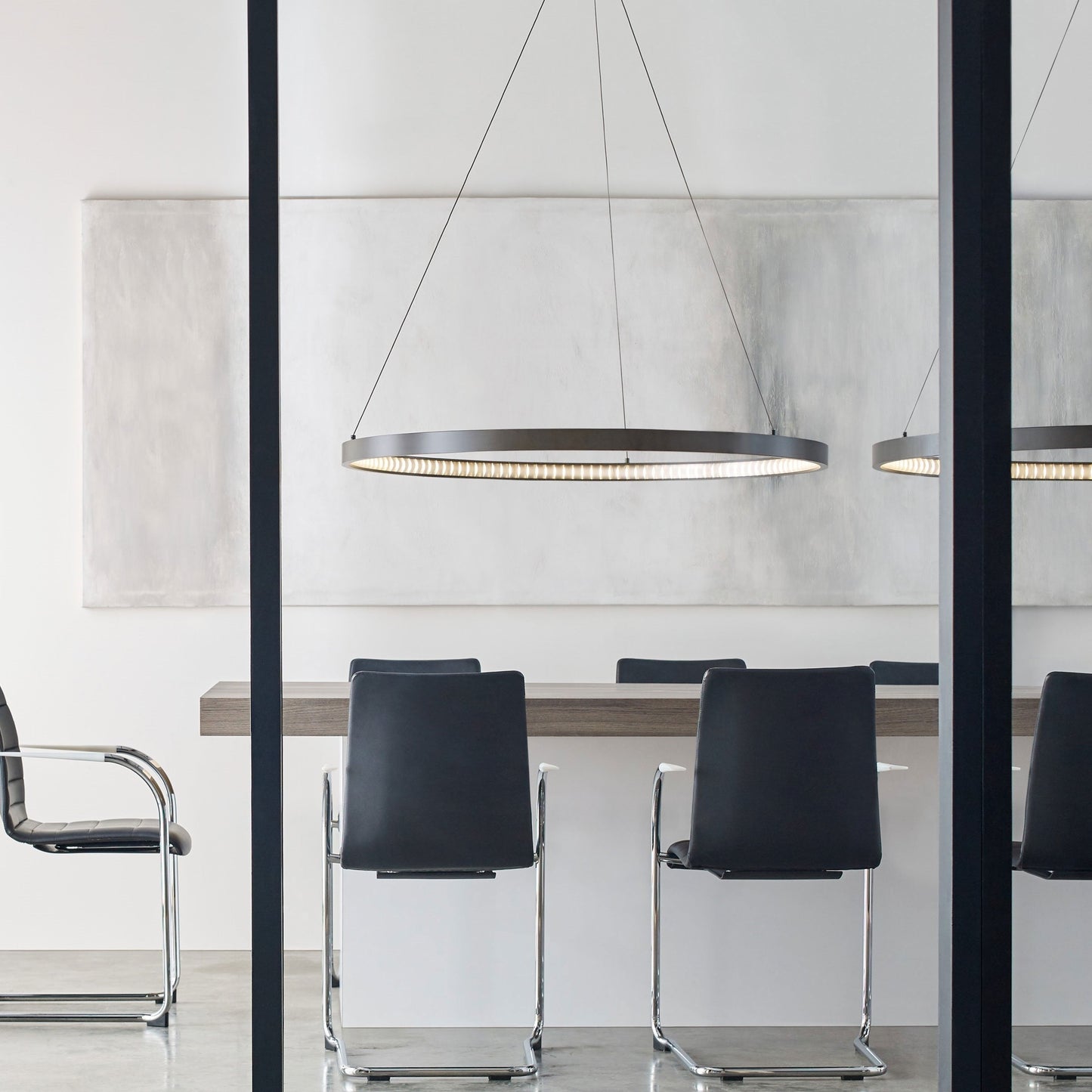 Inspired by large medieval cast iron chandeliers, the Bodiam LED Chandelier by Sean Lavin for Visual Comfort Modern features a thick outer metal ring that houses dual stacked rows of inward firing LEDs. These LEDs are treated with a special linear spread diffuser to create a unique twinkling effect while evenly distributing the light and minimizing glare. With a glare-free light distribution the Bodiam chandelier is ideal for family room lighting, foyer lighting and a number of commercial lighting applications. The 24- and 30-inch diameter Chandeliers are offered in three finishes and the Bodiam 48-inch diameter chandelier is offered in two finishes. Install independently or clustered together for an enhanced look. Lamping options are compatible with most dimmers. Refer to Dimming Chart for more information.