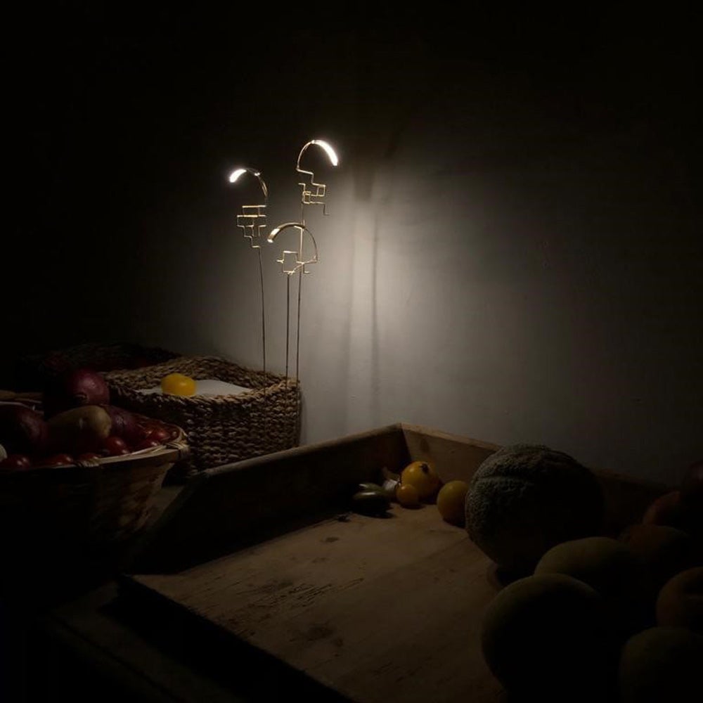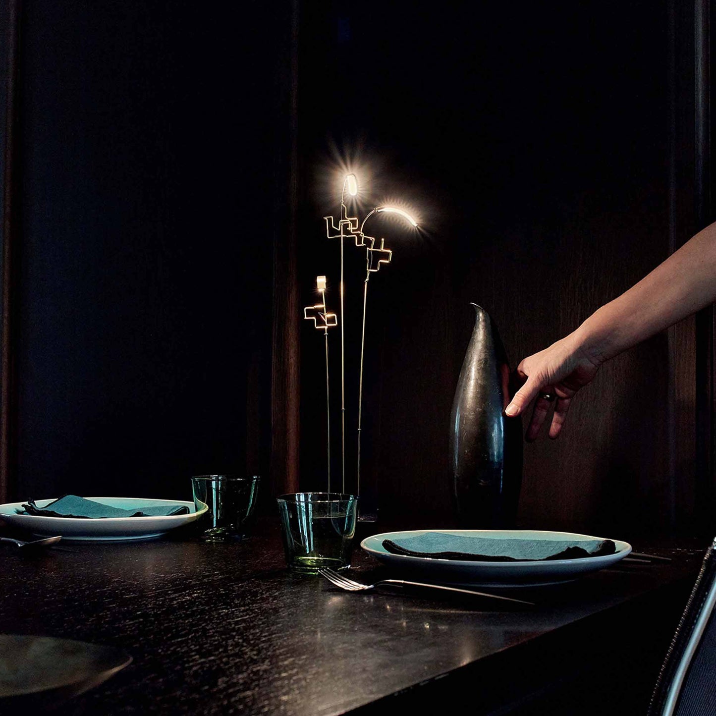 Cordless table lamp in steel and brass. Eric de Dormael, artist and sculptor, invites sharing, confidence and delicacy through a magical light, a chiaroscuro typical of candles. This jewel of light placed on a coffee table, bookcase or arbor opens up to the joy of meeting and lends the moment a sacred character.