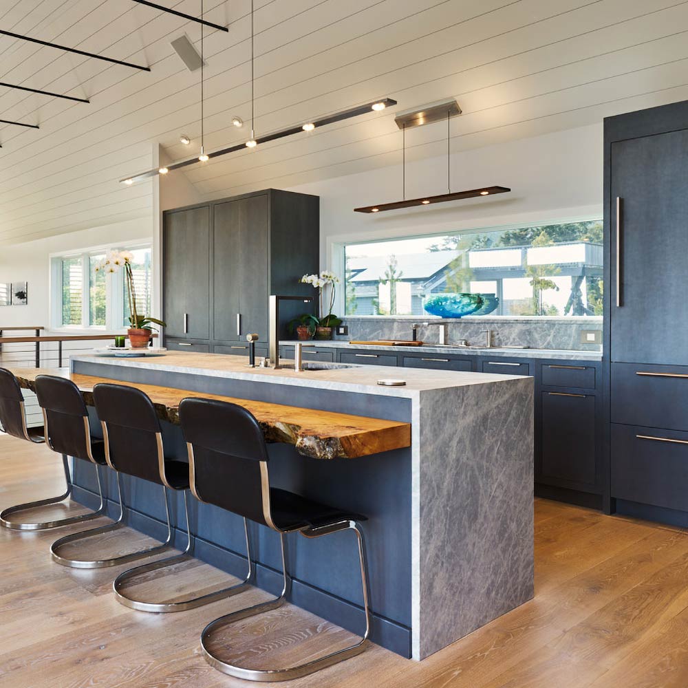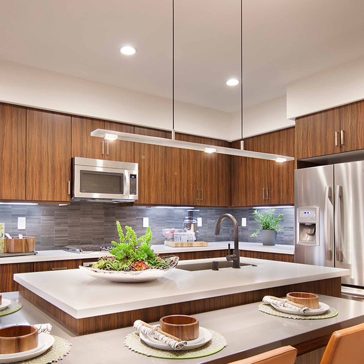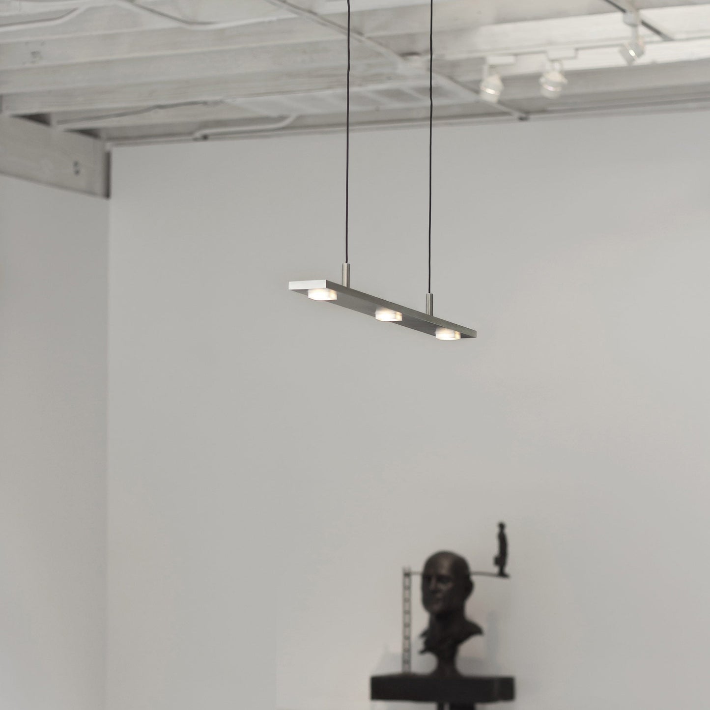 An assortment of uplights and downlights bless the energy-efficient Brevis LED Linear Pendant Light from Cerno, creating intriguing illumination effects in a modern space. Highlight a kitchen island or entertaining area with this minimalist yet elegant fixture featuring a matching metal bar and canopy with disk diffusers and a sense of creative structure.