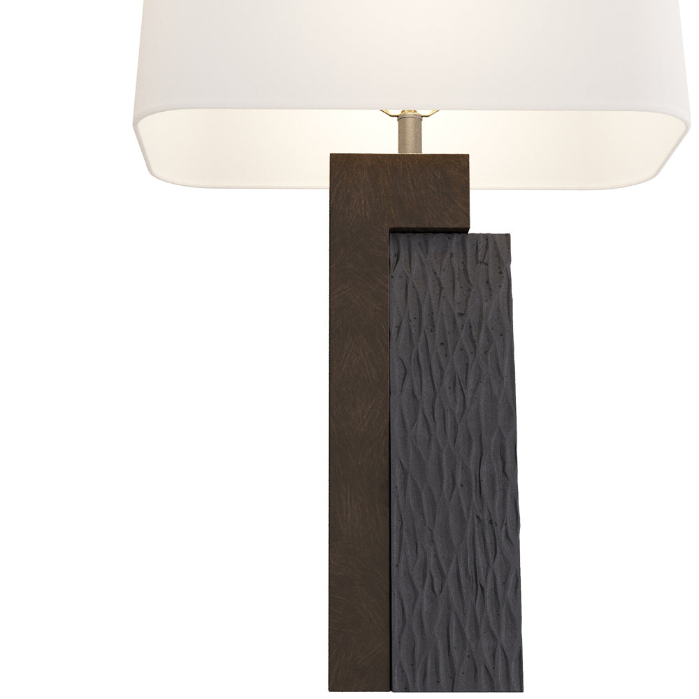 A conceptual design is minimalist at its core, bringing modern style to the Briarwood Table Lamp from Arteriors. Indulgent with architectural precision, this lamp features a pieced body made of charcoal rice stone composite with English bronze finish steel adding a dramatic complement. Structural and yet flattering with a boxy white fabric shade, its contrasting palette brings a sharp update to custom spaces.