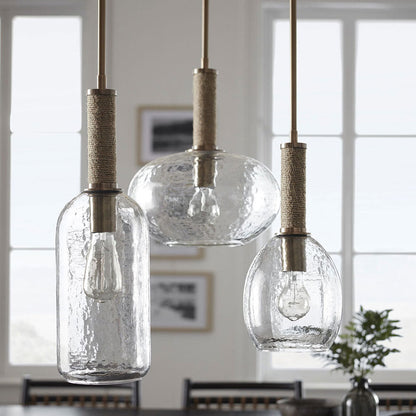 Hand-blown rippled glass creates texture and organic drama for the superb Bronson Pendant Light from Palecek. A striking addition over a kitchen island or in a dining room, the pendant is accentuated with gleaming antique brass and textured jute wrapping that create exceptional contrast and warmth. Various length rods are included to place this pendant at the perfect height for any space.