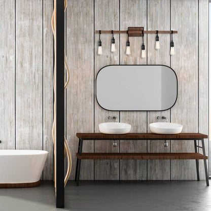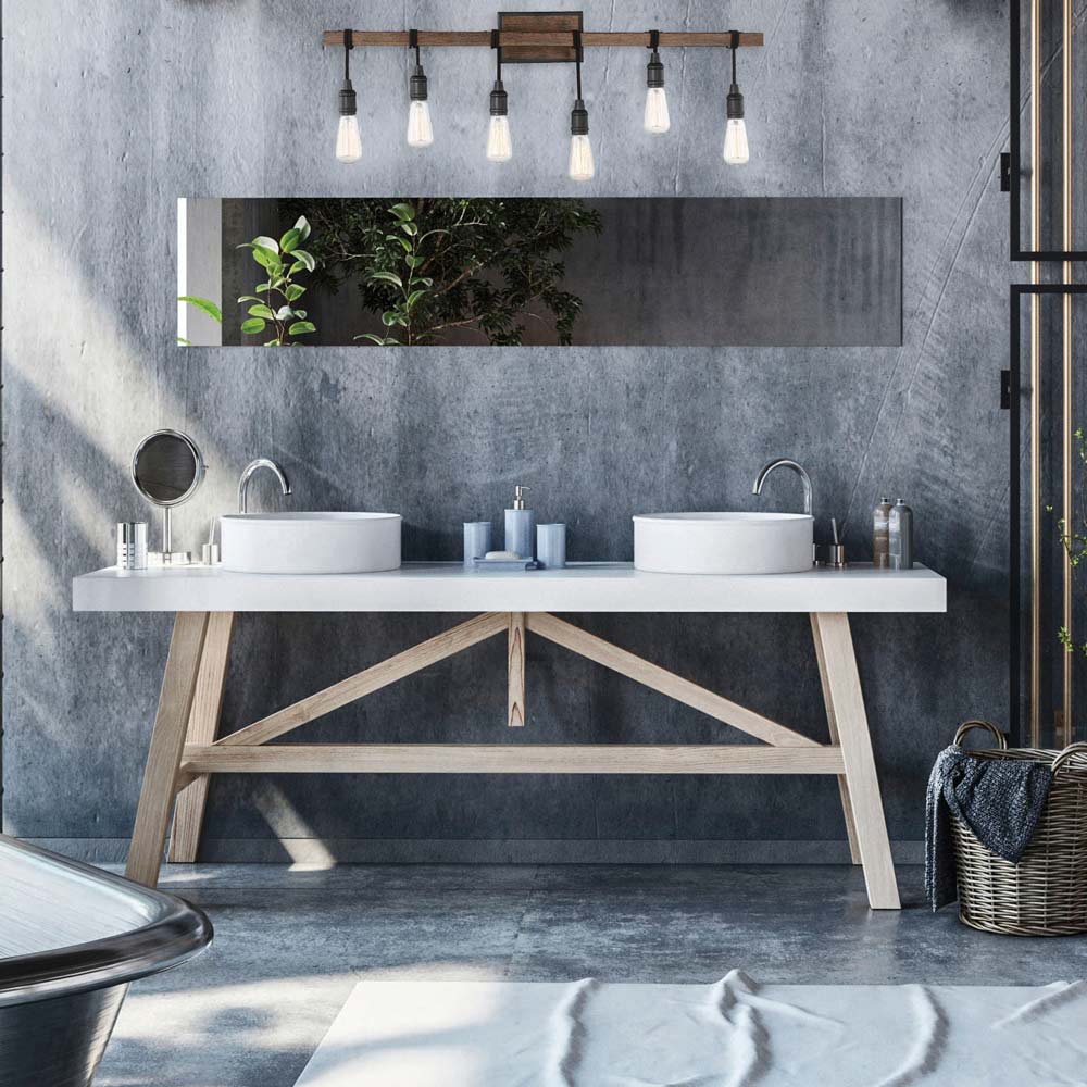 Create a rustic farmhouse aesthetic with a touch of industrial attitude as you select a light source that fits into a casual bath space. The Burgess Vanity Wall Light from Savoy House offers an unusual barn theme to create whimsy in an ensuite or guest bath, highlighting a vanity and inviting a bevy of corresponding décor elements. Dropped lights suspend from a horizontal bar at customized lengths, delivering a laid back feel of easy living.