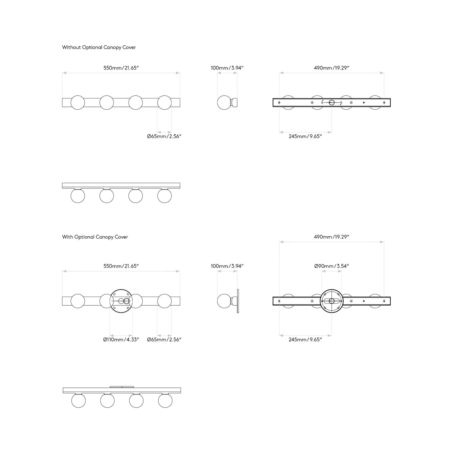 - 4-Light: 21.65"W X 4.33"H; 3.94" Extension