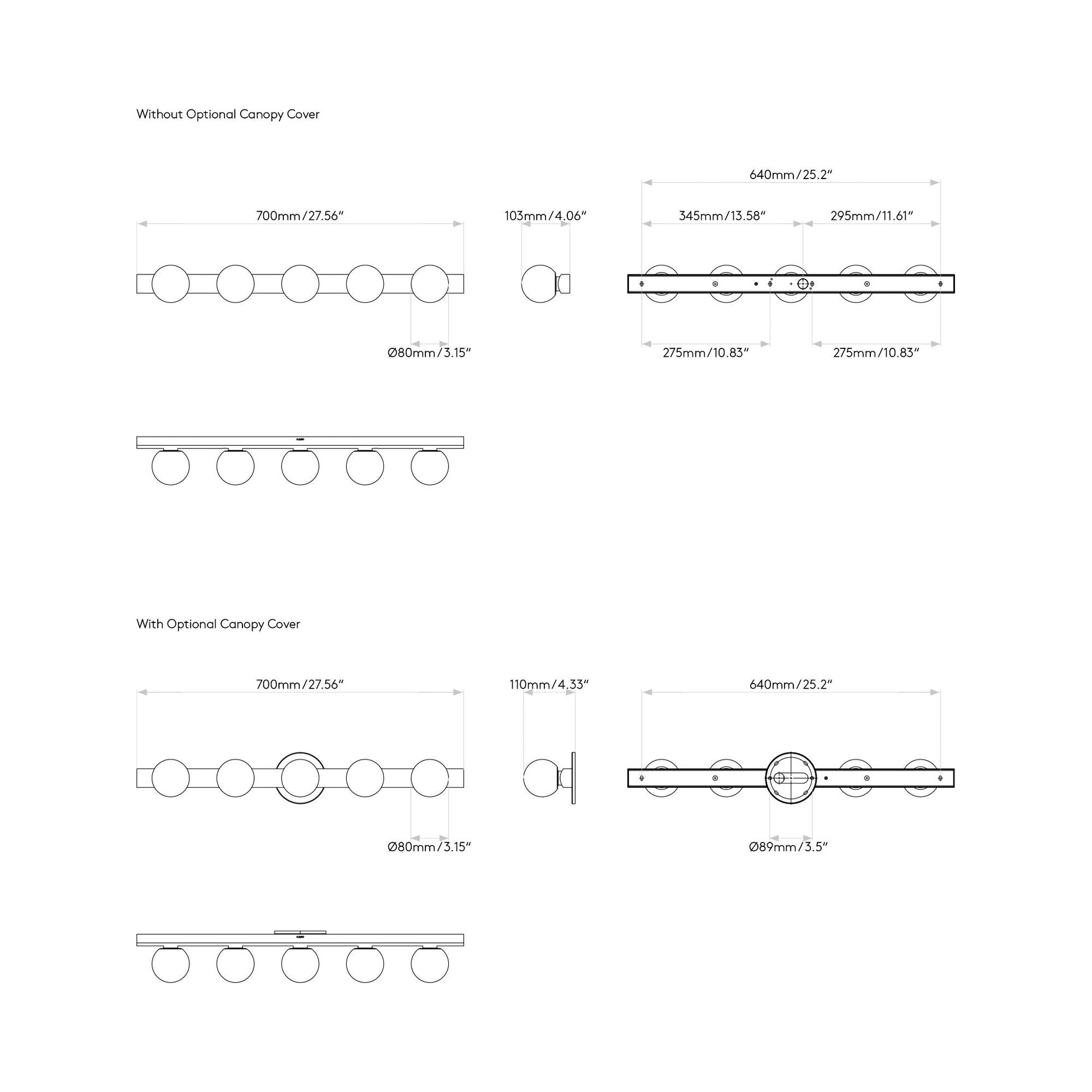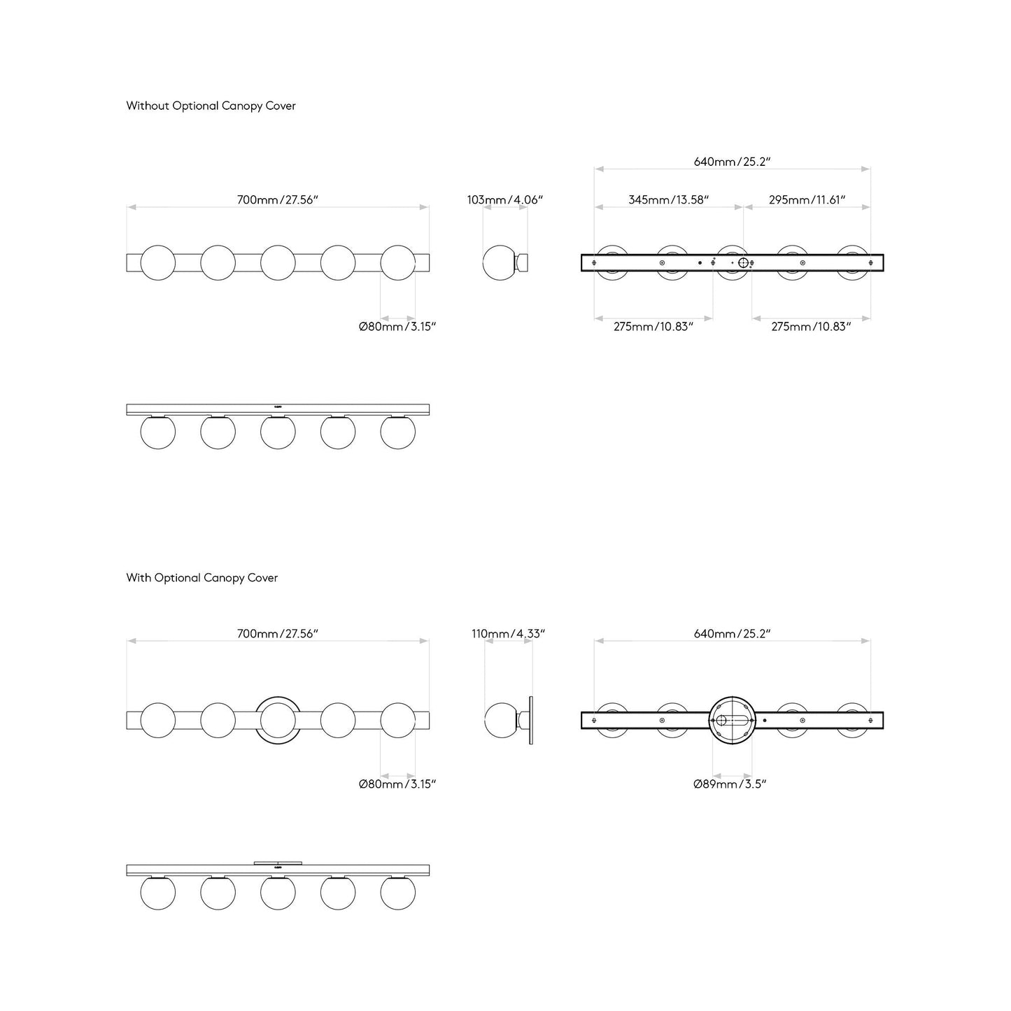 - 5-Light: 27.56"W X 4.33"H; 4.33" Extension