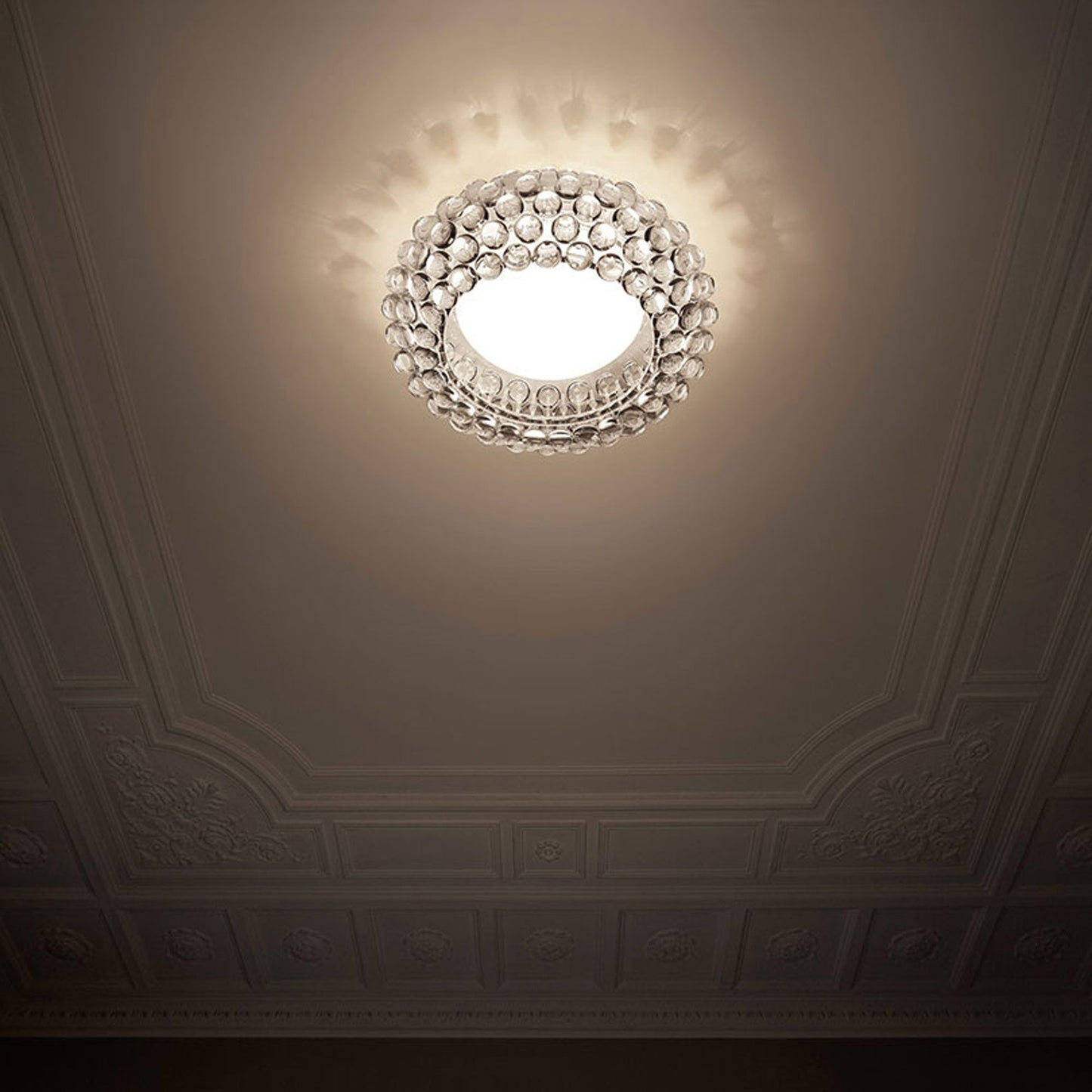 Sway under the dazzling design of the energy efficient Caboche Plus LED Ceiling Light from Foscarini. Brilliant bursts of light dance like diamonds throughout the sparkling transparent pearls of the shade, perfect for illuminating a grand entryway.