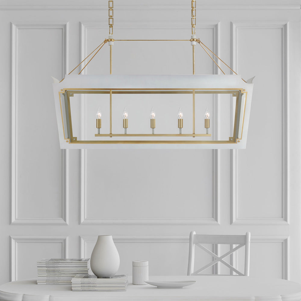 Designer touches bring a sophisticated sensibility to the Caddo Linear Pendant Light from Visual Comfort Signature. Beautiful over a dining table or kitchen island, it sports a bold frame in a two-tone finish that enlivens its candelabra lights to perfection.