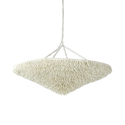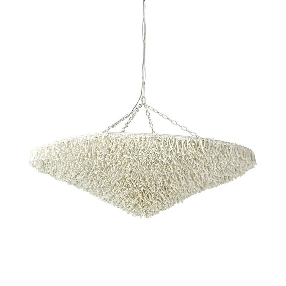 Focus on the chic design power of texture in a light fixture with customizing and versatility on the same page. The Cadiz Chandelier from Palecek borrows from coastal fare with creamy tone feather-shaped cream finish wood beads sewn over a metal frame and dressed up with finely woven white abaca rope details. The result is a stunning and shapely chandelier that introduces a one-of-a-kind primitive art vibe worthy of placement in a visible spot.