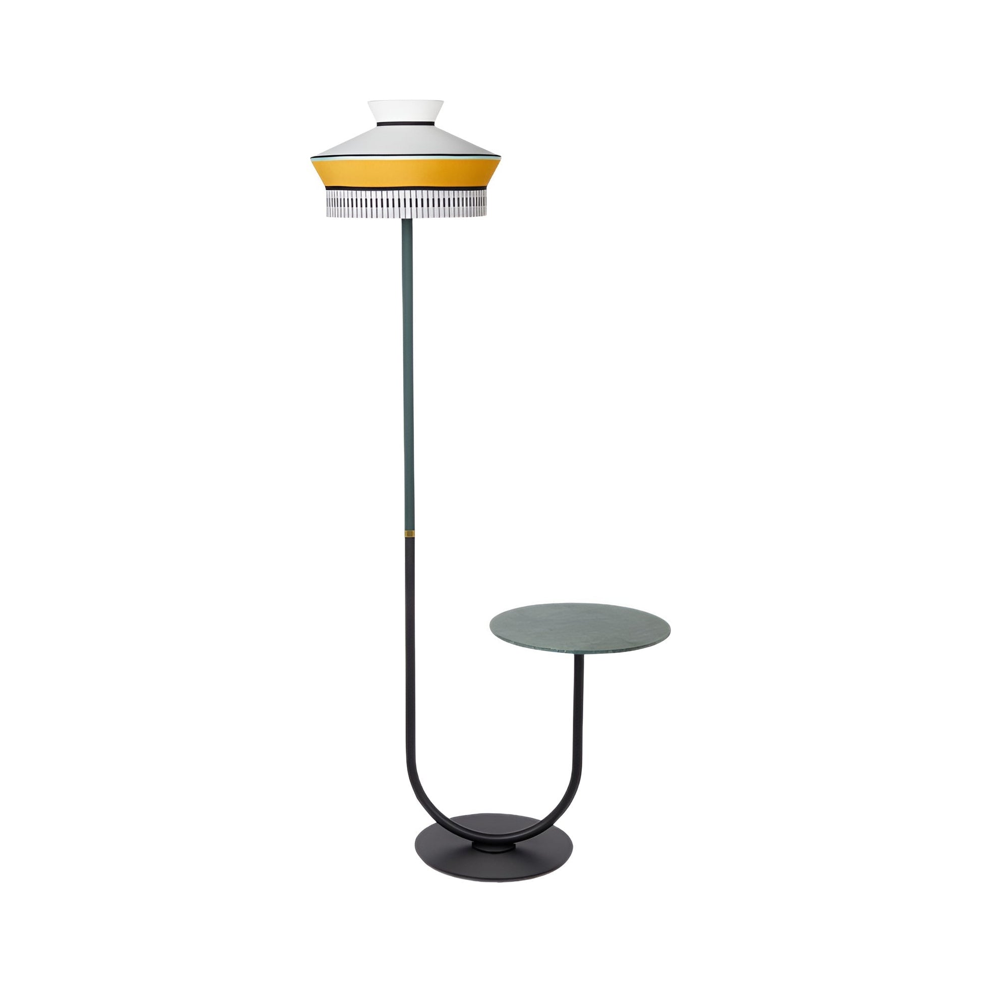 A charming J-shaped hook frame brings playful functionality to the Calypso Martinique Floor Lamp from Contardi. It's compact tabletop space offers a spot for a refreshments or your tablet, while a charming shade offers a perfect touch of vintage whimsy. Allow this stylish lamp to anchor a cozy reading nook or a pair of living room accent chairs.