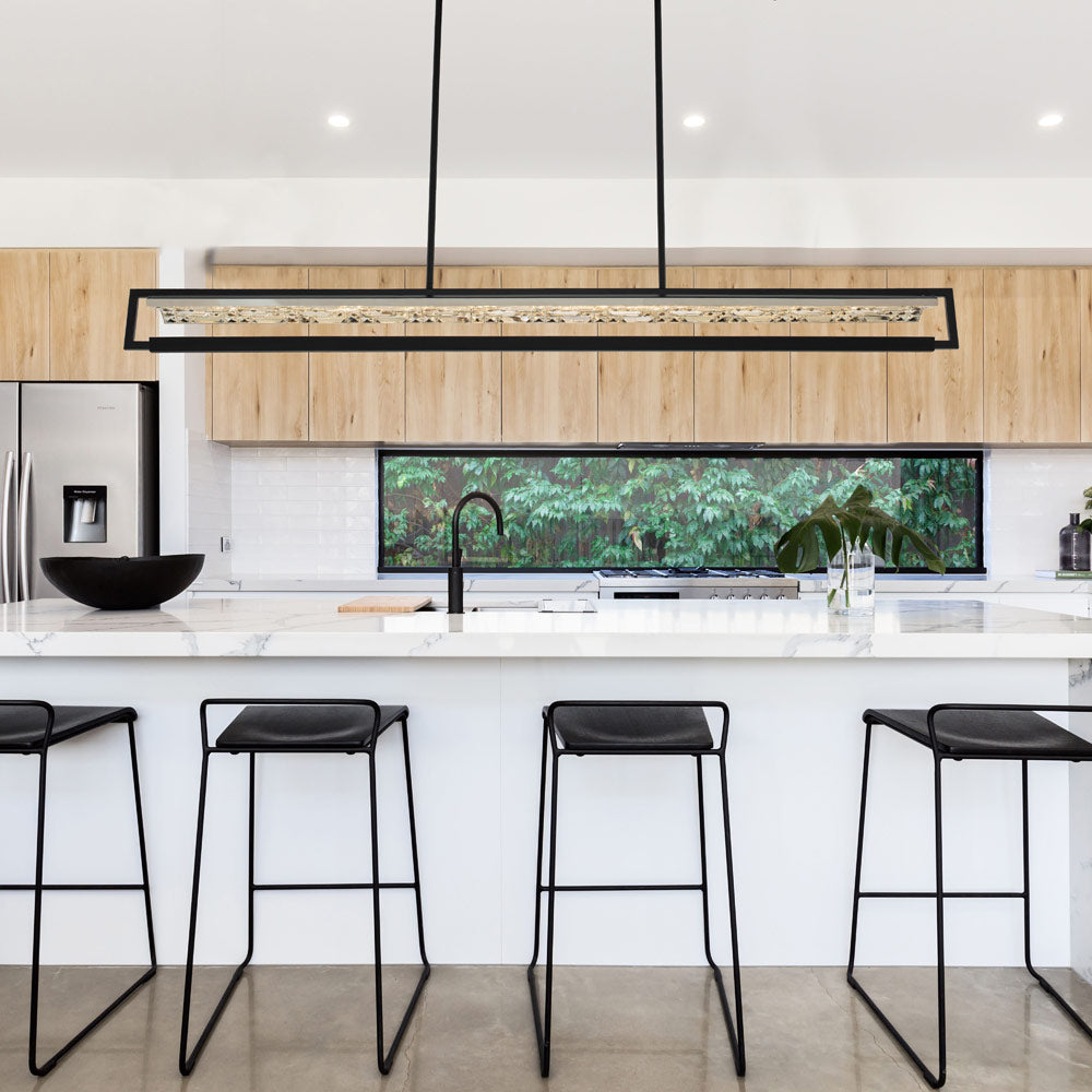 A matte black finish creates a sense of elegant simplicity for the Capuccio LED Linear Pendant Light from Allegri. Within, a bevy of faceted crystals create sparkling reflectivity and sophistication, delivering understated glamour over a kitchen island or in your grand dining room.