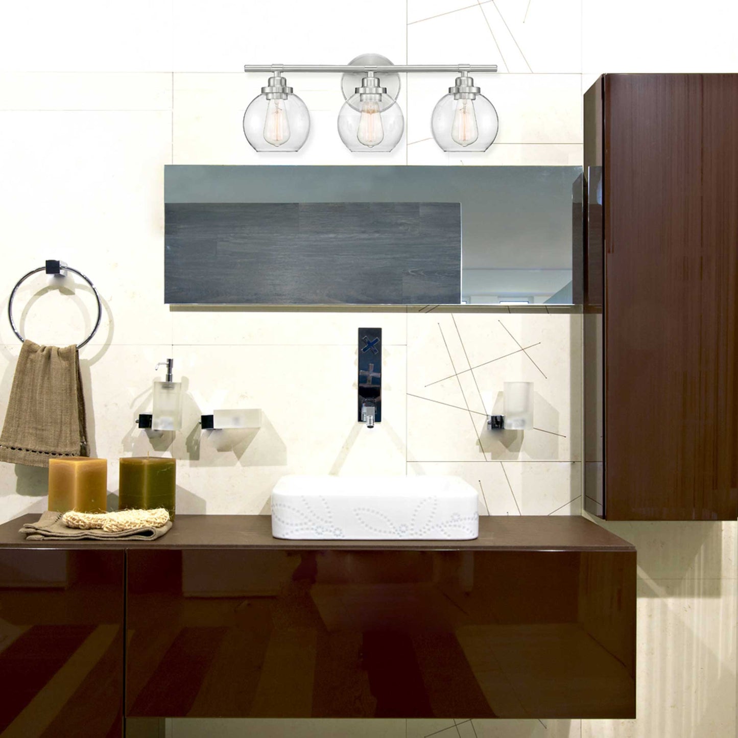 The Carson Vanity Wall Light from Savoy House turns to basic silhouetting to make its point in a custom ensuite or guest bath space. Delicacy reigns supreme with clear glass demi-globe shades, as basic geometric shapes fashioned of metal provide decadent contrast.