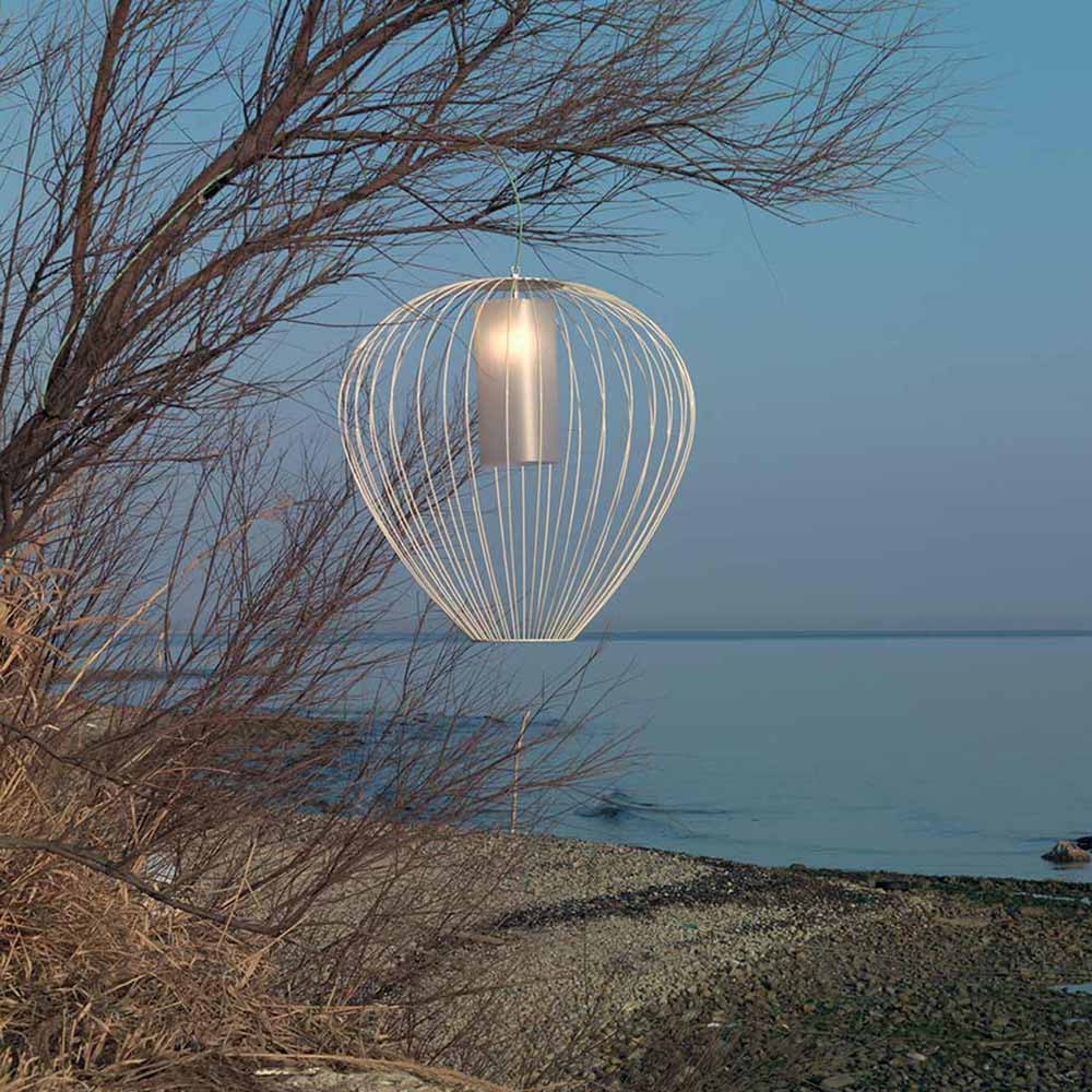 Hang the Cell Outdoor Pendant Light from Karman above a tablescape or outdoor bar area for a stunning lighting display. Suspended in the middle of a lantern-inspired open air cage is a single white cylindrical lantern that offers a serene glow.