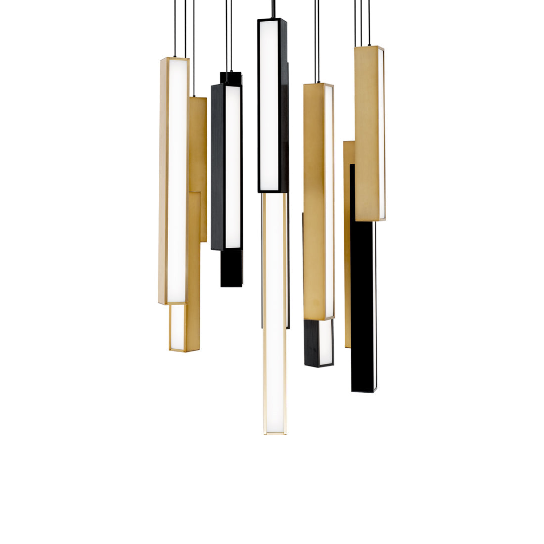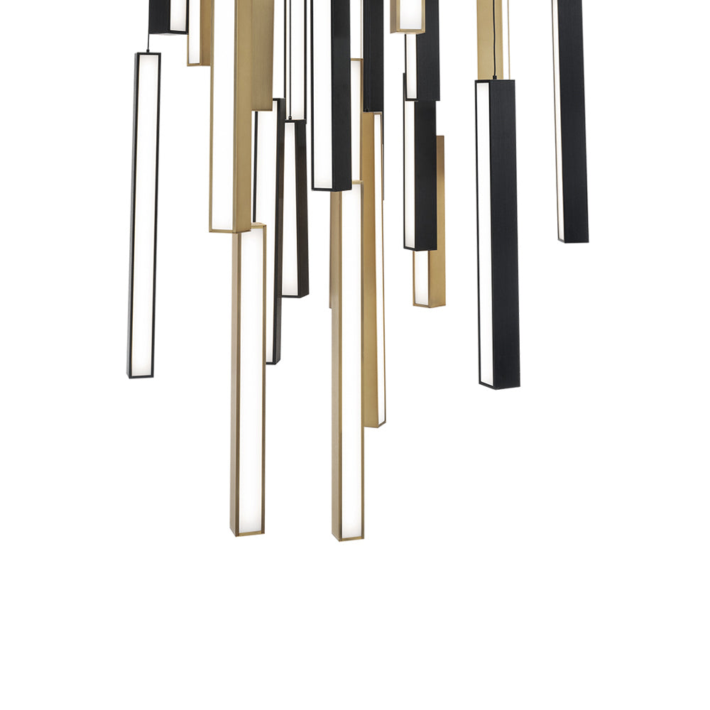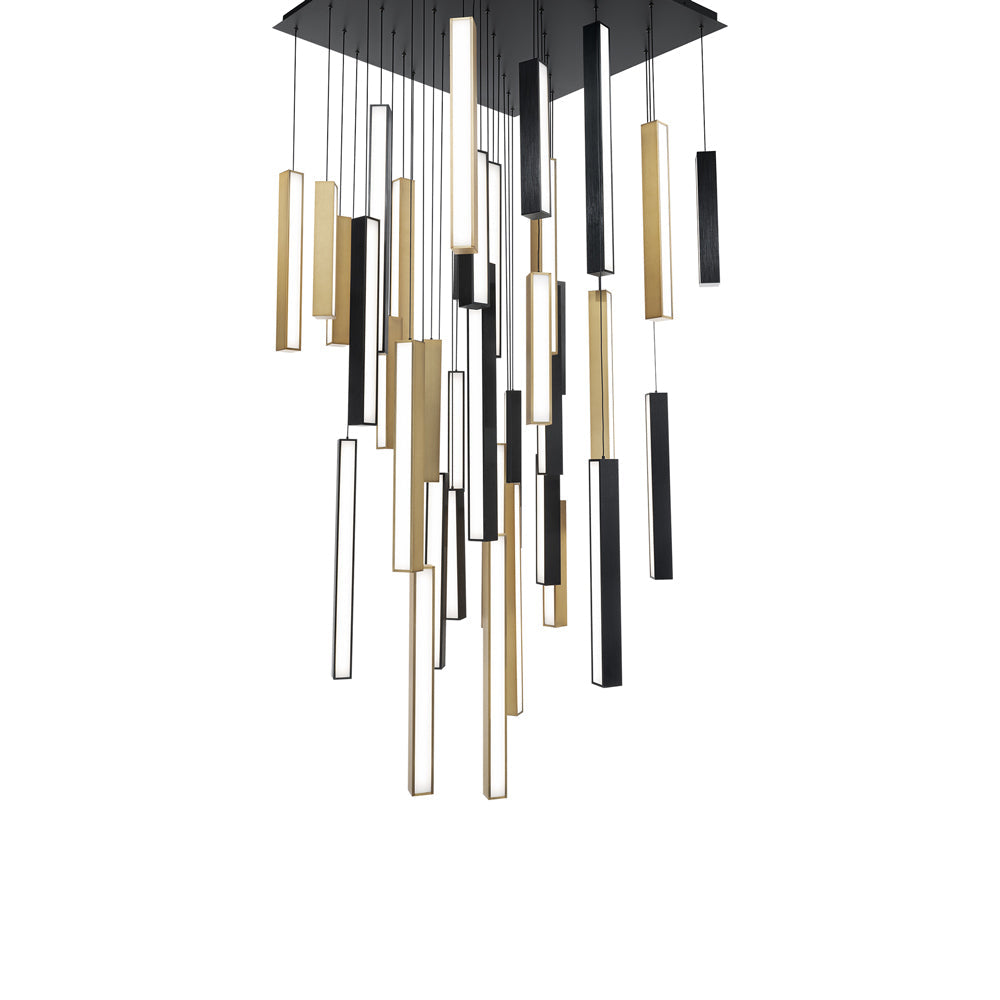 Chic light bars are suspended vertically to evoke floating piano keys in the impressive Chaos Square LED Pendant Light from Modern Forms. It’s a striking composition, featuring metal frames and white diffusers, delivering radiant ambiance over a living or dining room.