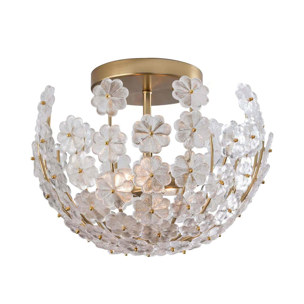 Delicate petals fashioned of cast glass deliver floral splendor to the Charlotte Semi-Flush Mount Ceiling Light from Regina Andrew. Engaging botanical vibes prove artisanal elegance in a fixture framed in rich natural brass metal. Light reflects with intriguing effects, illuminating a glam-inspired kitchen, foyer, or dining space.