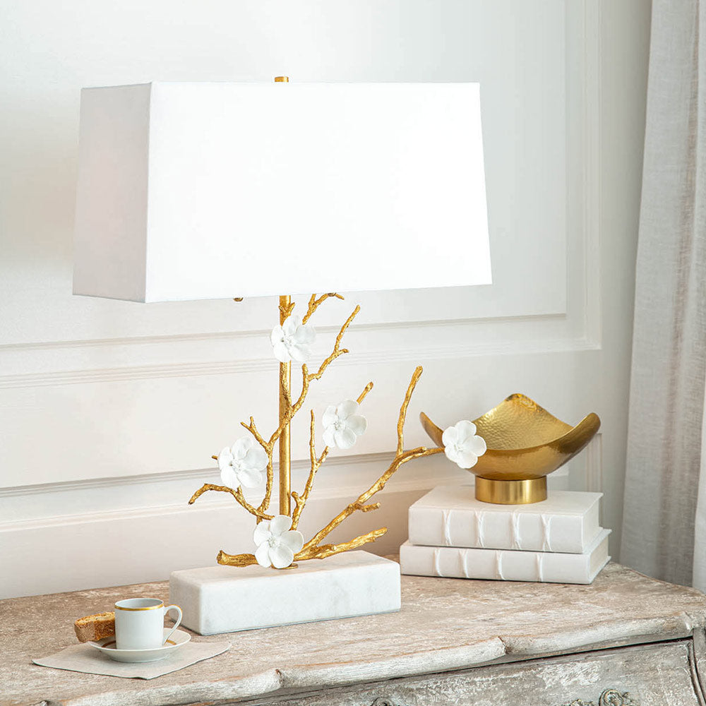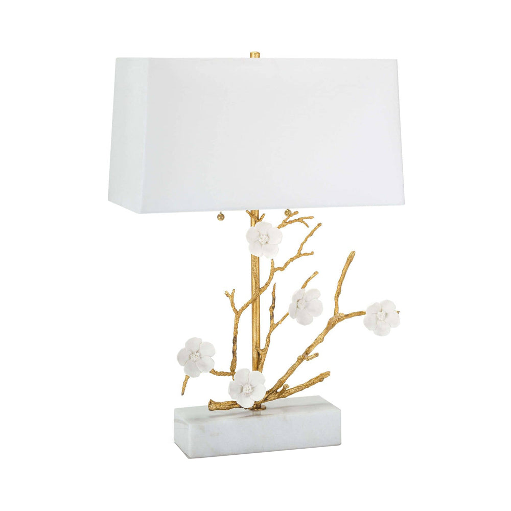 Splendor in artistry turns organic and botanical as the Cherise Table Lamp from Regina Andrew puts on a show of sheer elegance. Breathe artisan life into a custom setting with this inspired lamp featuring cast metal branches and white porcelain flower emblems, arranged to perfection. This lamp achieves proportionality with a boxy fabric shade and block base.