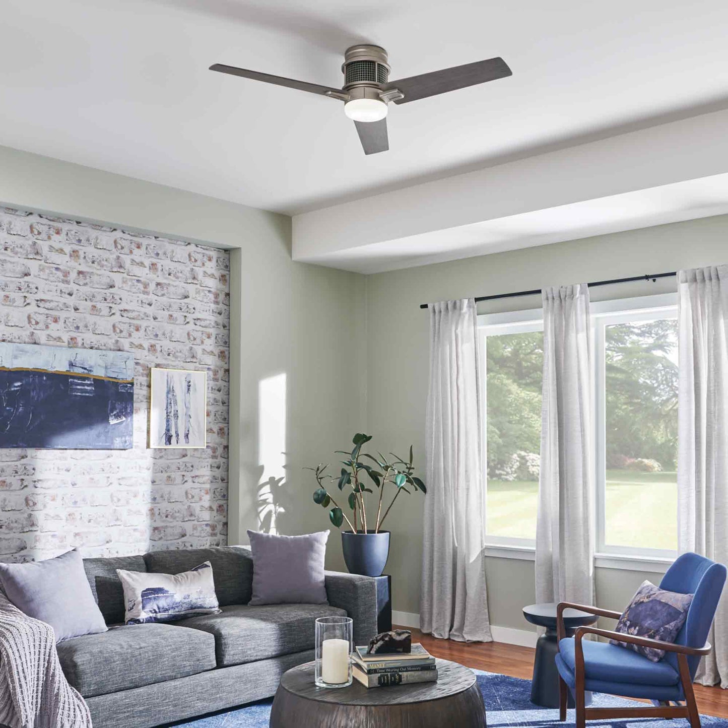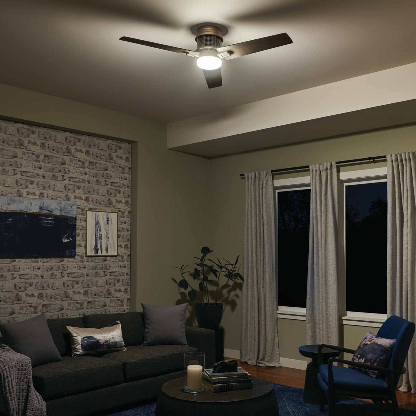 Vintage accents give this Chiara LED Ceiling Fan in Brushed Nickel and Olde Bronze its signature industrial style. Mesh inlays, weathered-wood look blades and a ceiling hugger design is at home in a variety of indoor spaces.